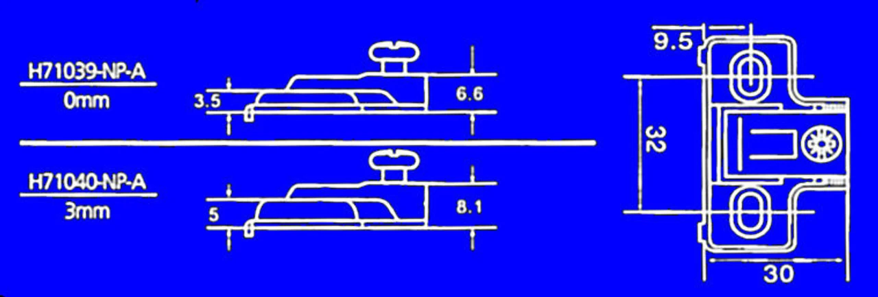 0mm Mounting Plate one of the suggested For H71037-NP-A Liberty 35mm Face Frame Hinge.0mm rise. Please see schematic drawing. Overall Dimensions are 2″ width x 1/4″ height approximatley .