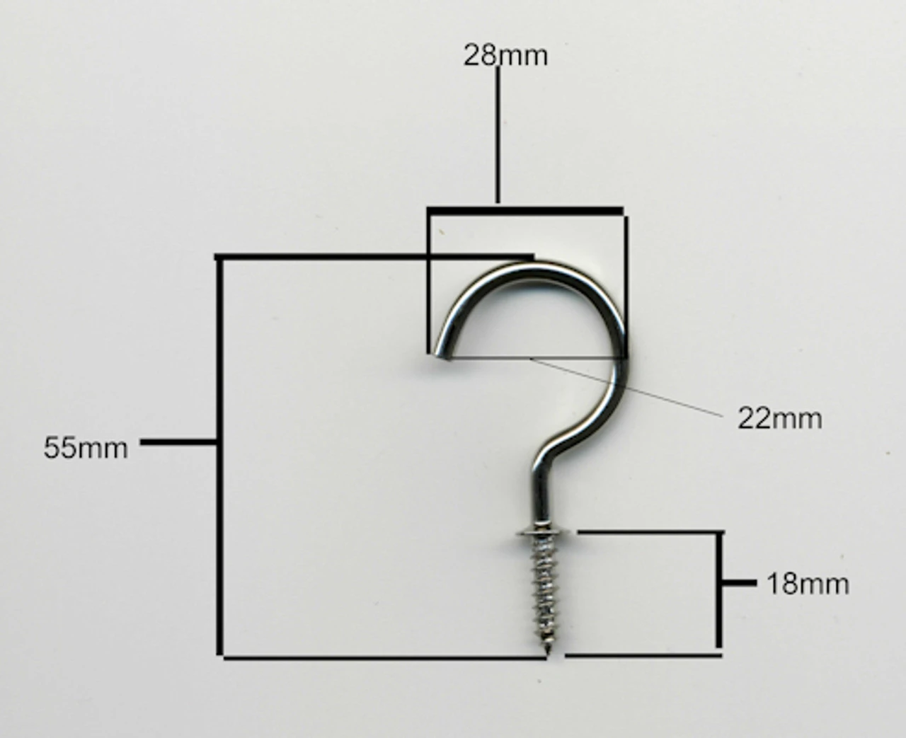 A Cup Hook – Box of 100 ea. Hook Bright Nickel Chrome Plating and Screw Tip Base The Hook would be appropriate for a wide range of uses. Hook is measured from the shoulder to the bottom which equals 1-1/2″