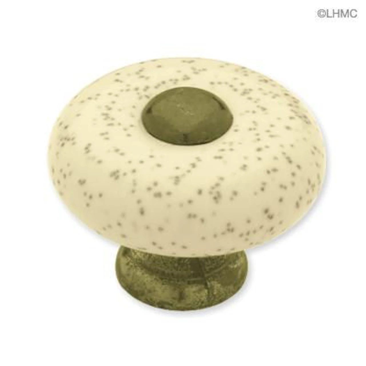 Porcelain Knob – Color Called Oatmeal Antique English Plated metal finish. Old Fashion looking style knob. Porcelain knob with brass button on the top. Great for cabinets or drawers. Recessed threads. Matches pull DL-P2504-2-OAE