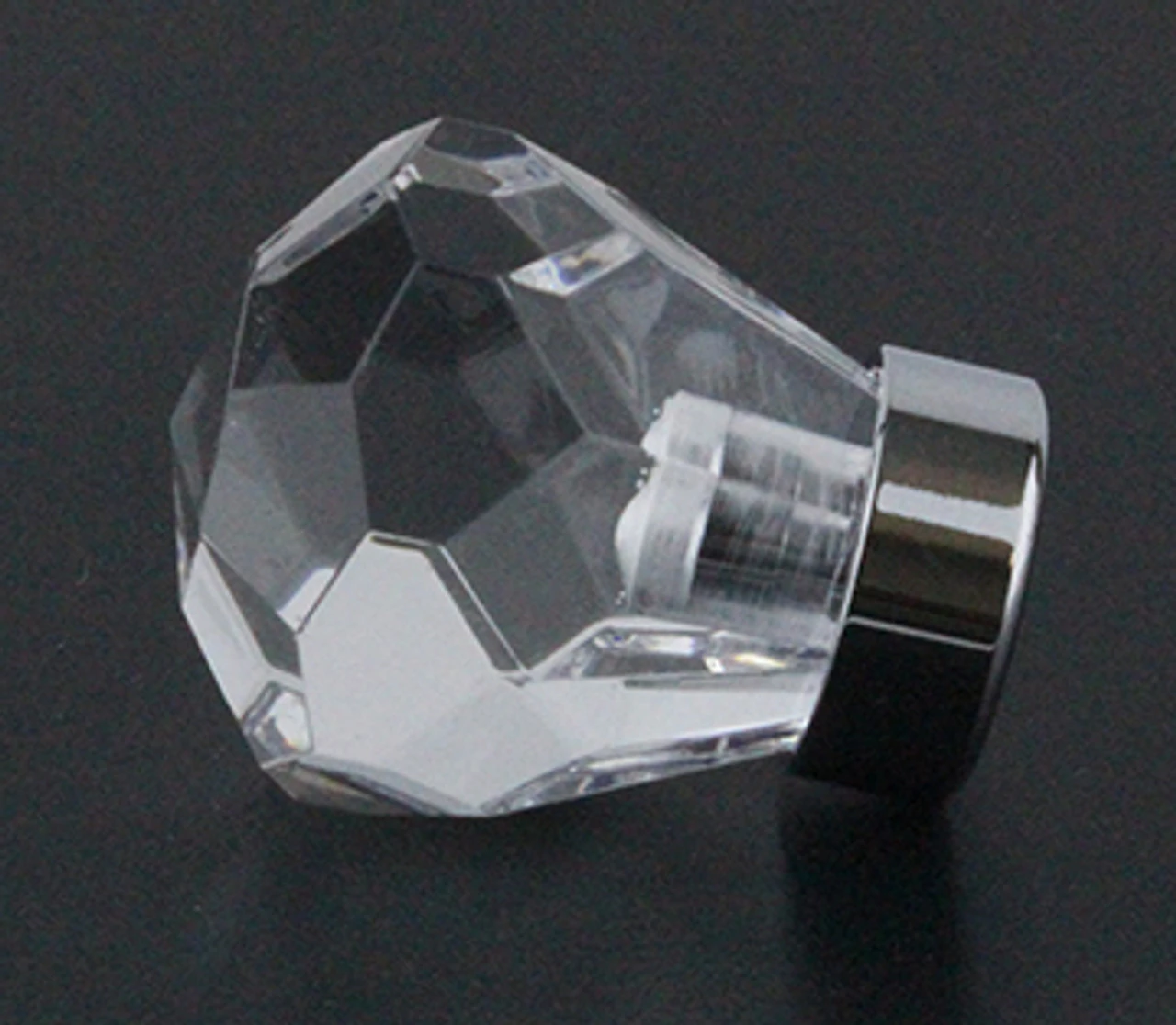 1-1/8″ Crystal Acrylic Diamond Cut Clear Knob. Gracious faceted crystal clear acrylic knob looks like it belongs on a ring. Chrome Solid Brass metal base. This inexpensive knob can look absolutely fabulous on the right piece of furniture.
