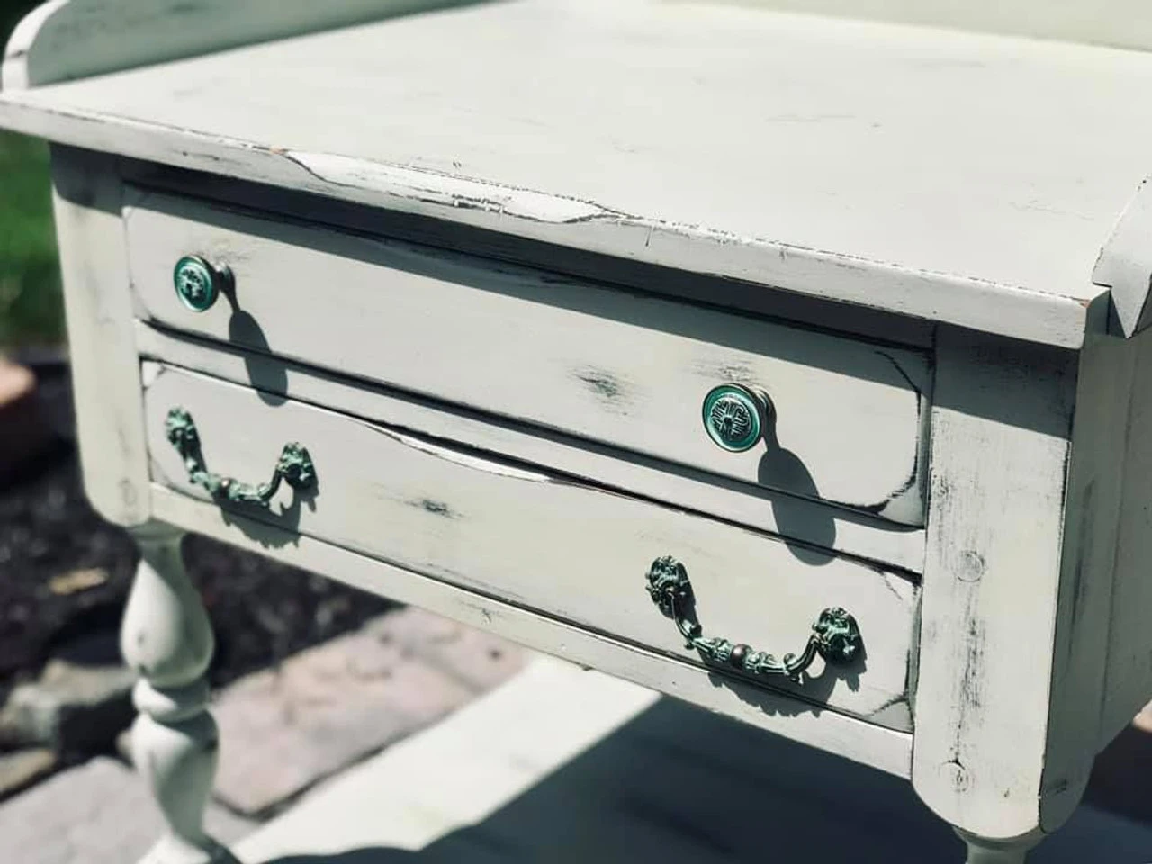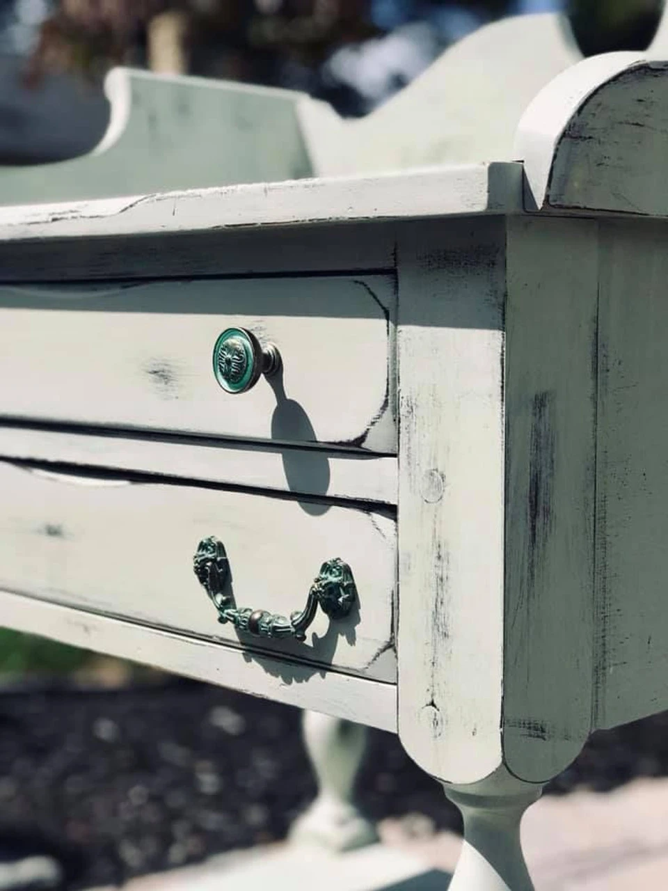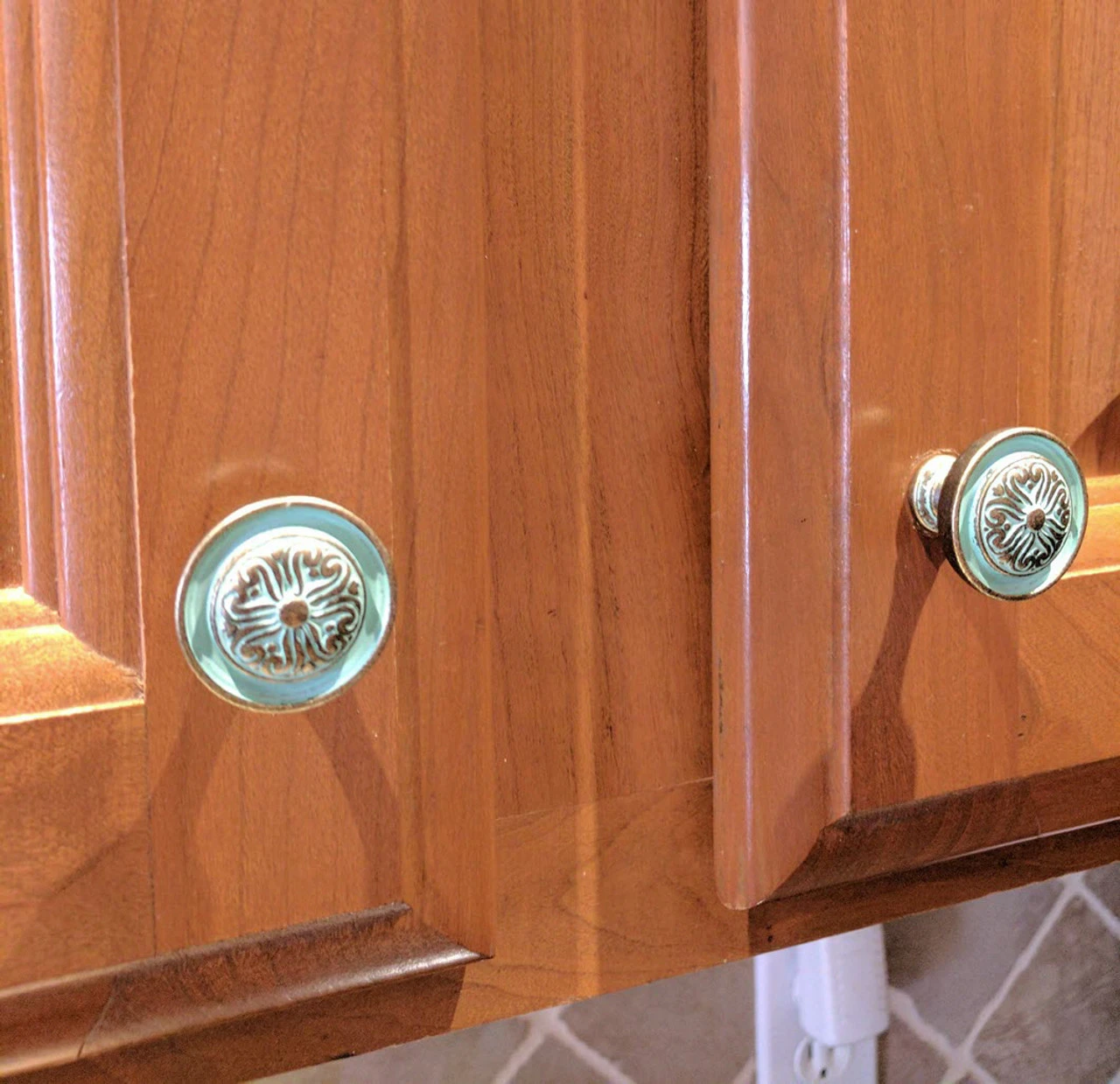 We made this knob to partner with our Baroque Scroll Work Verdigris Cup Pull DL-P2683-064VDG. We got our first in use pictures of these beauties from Carolann, a Facebook friend of ours! More to come in her beautiful kitchen! They add the perfect splash of color! They are matched with our rose pattern verdigris cup pull from the same section.