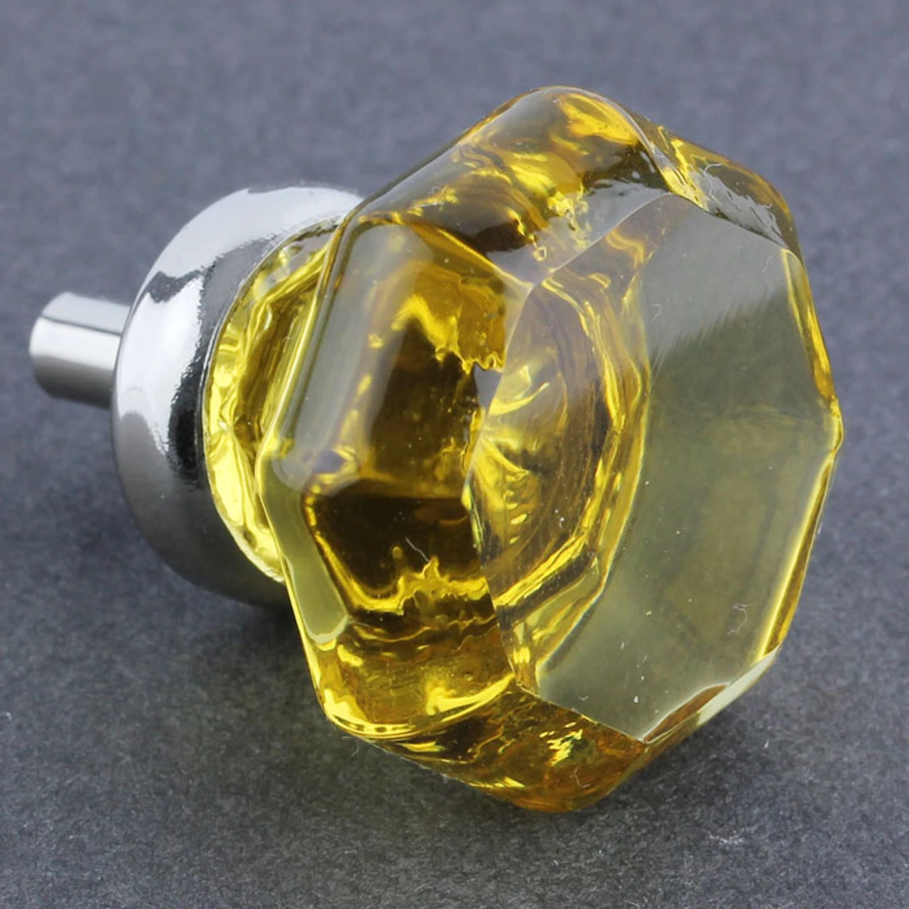 Amber glass knob, set in a chrome base. If your looking to bedazzle, this is your knob. This glass beauty works well in both modern and antique decors. Would look almost original on antique furniture.