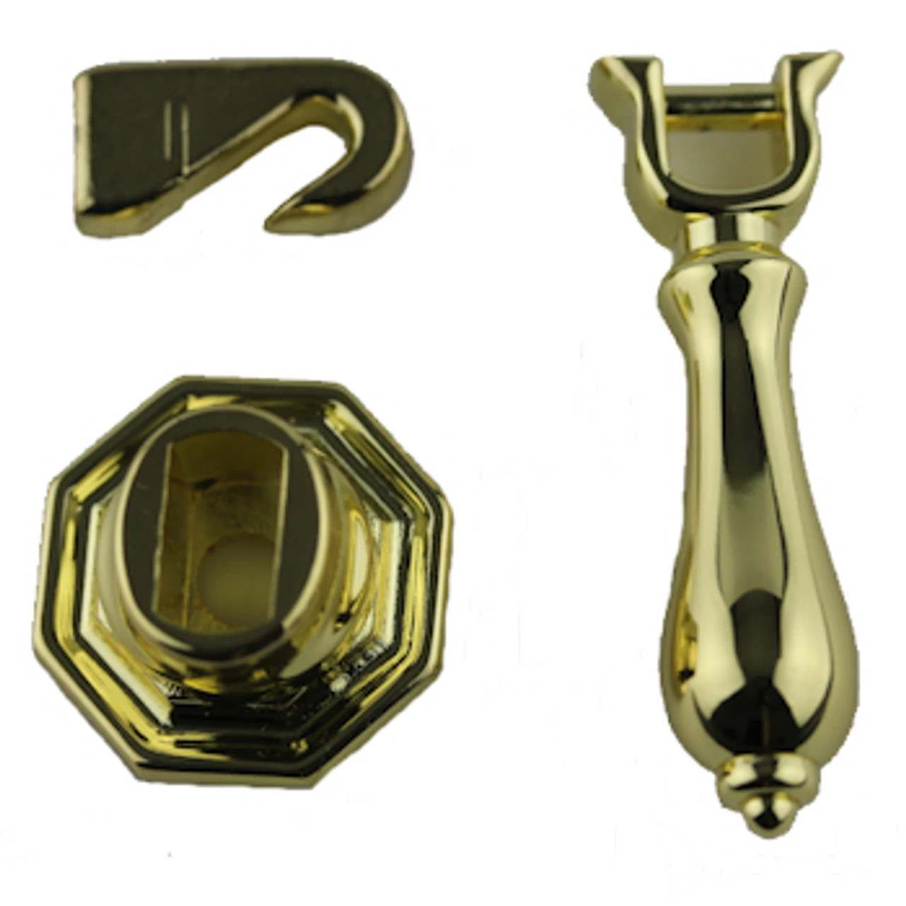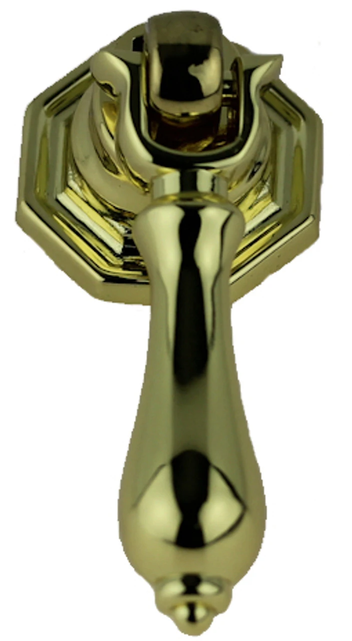 Traditional hexagon style drop pull in brass plated finish. We have a few sets of nice additional pictures from customers! Thank you Lorraine! I love the brass and blue together!