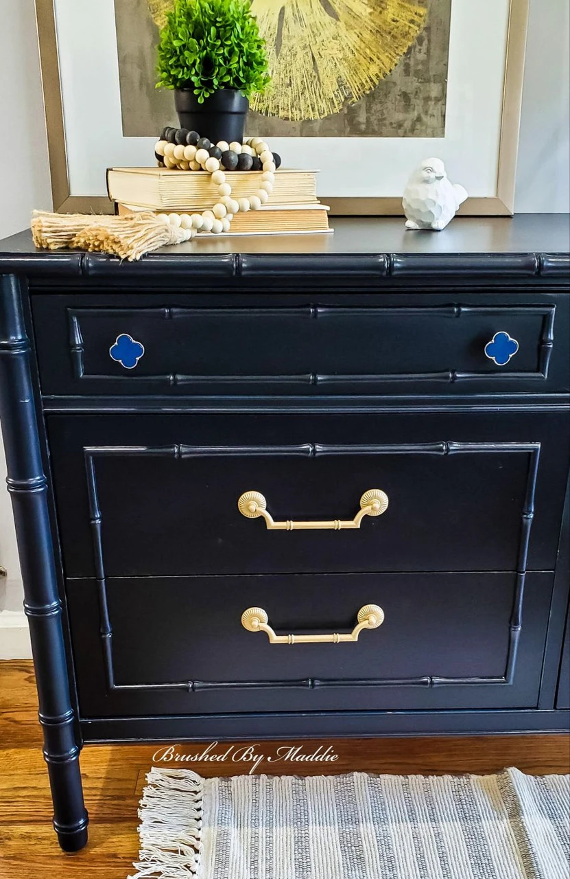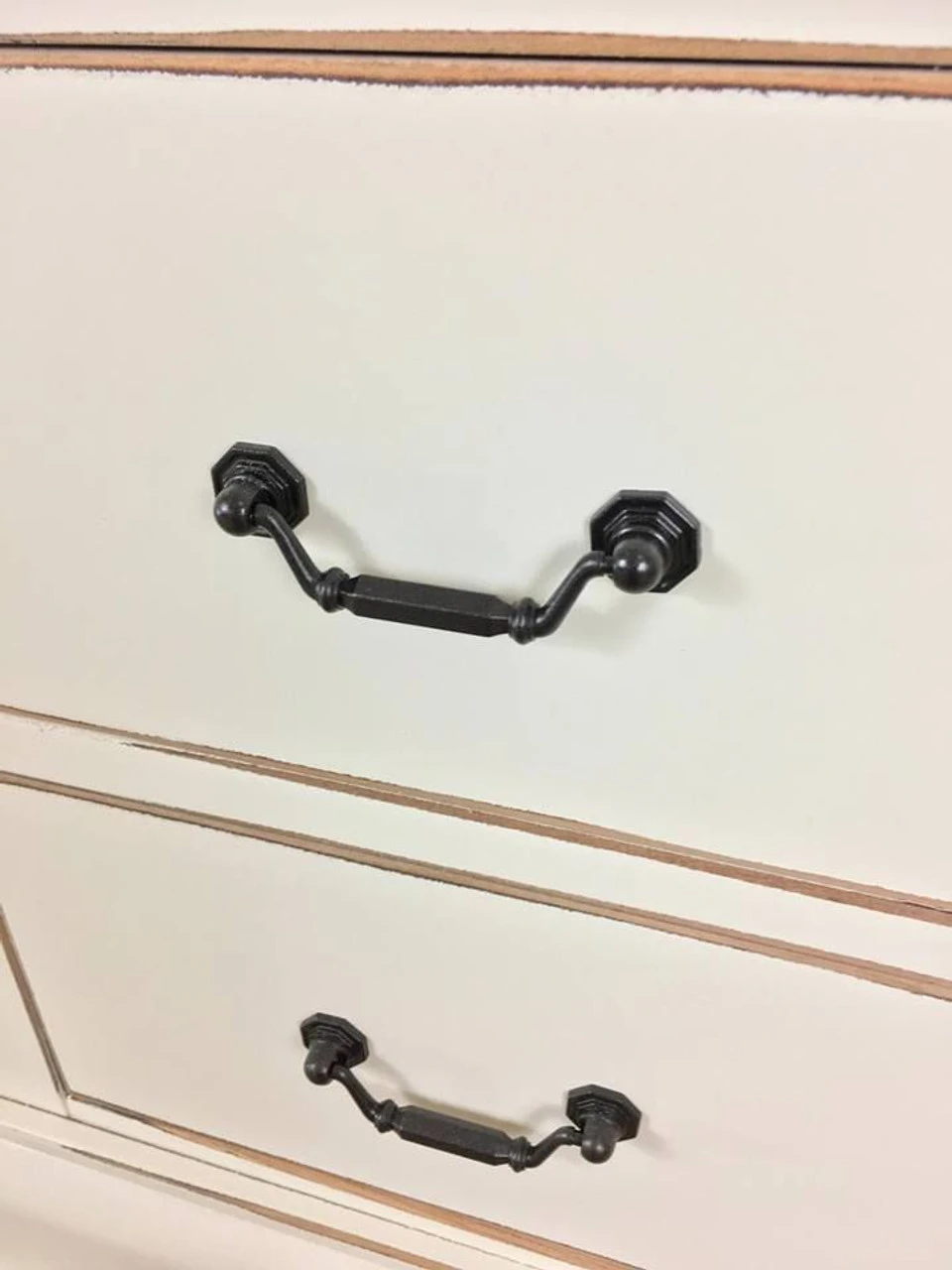 Traditional Bail pull with bail and Octagonal rosettes to match knob. Plated in high polish gold. Has a matching knob CB-PN0234-GLD-C. The additional photos are from The Emily Ann Collection on a beautiful dresser. The pull is obviously painted to get the look she wants. Beautiful result!