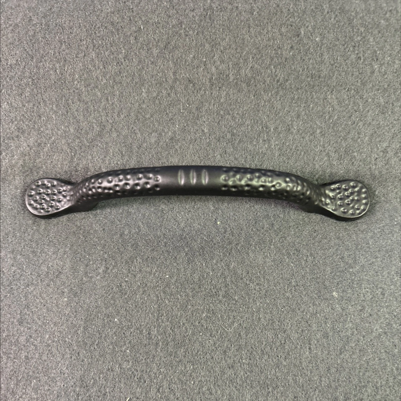 This hammered pull has a spoon foot on each side with a bow in the middle. Perfect look for an aged room decor.