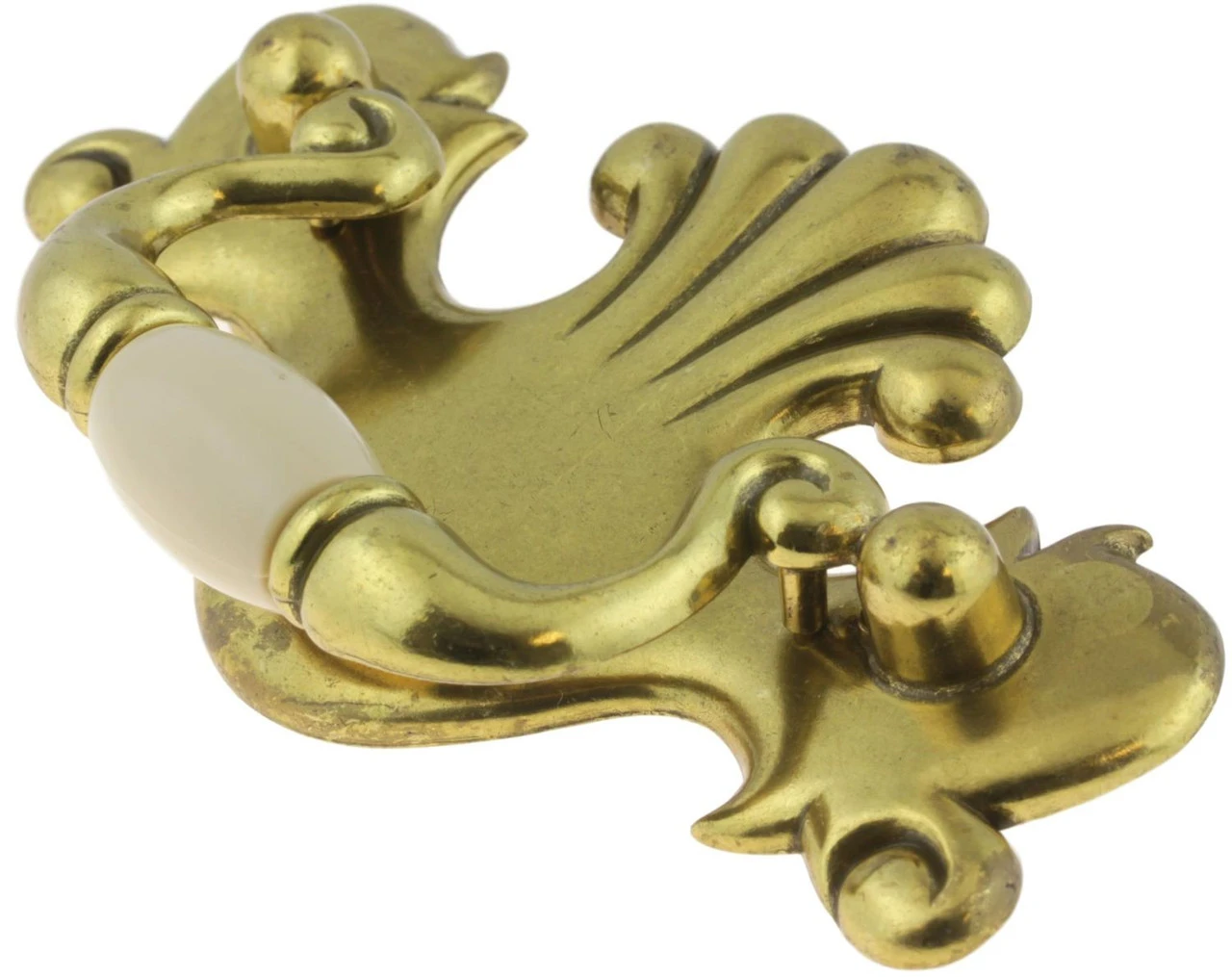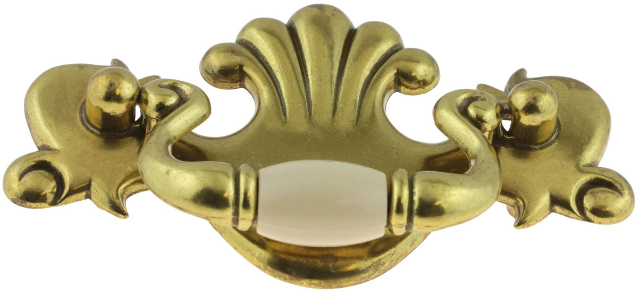 This unique bail pull has a beautiful antique english finish. The bail is also antique english with an almond plastic insert. Keeler Brass item. Requires two 3/4″ Screws for 3/4″ thick board due to thread jacket that extends into screw hole.