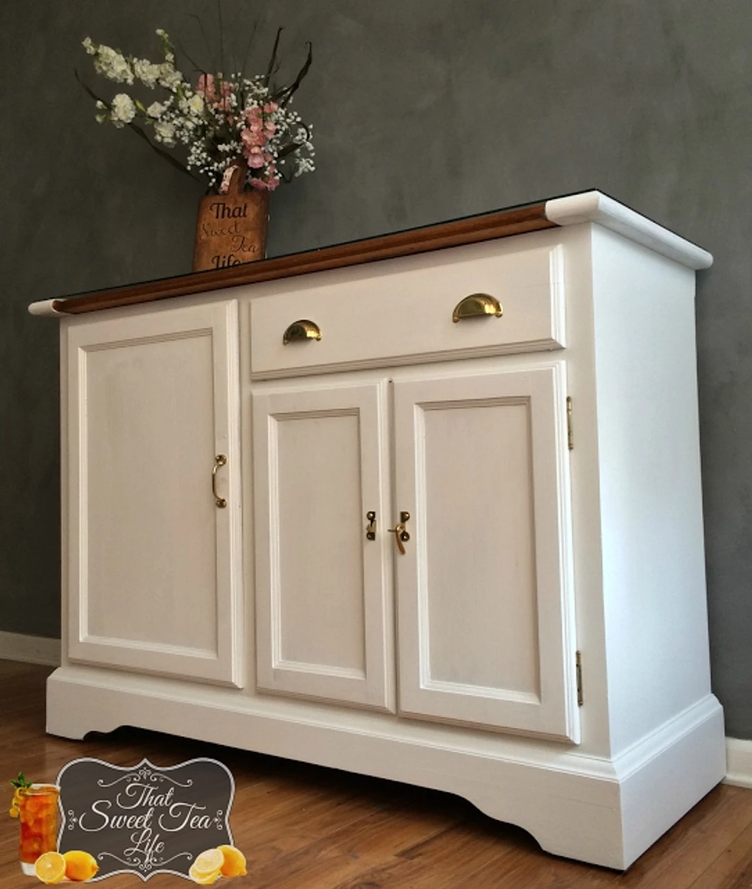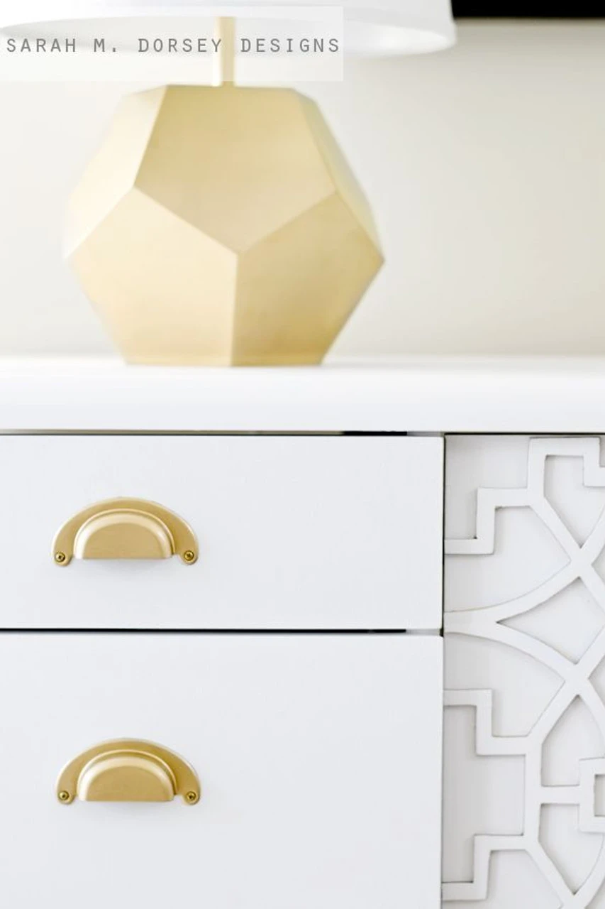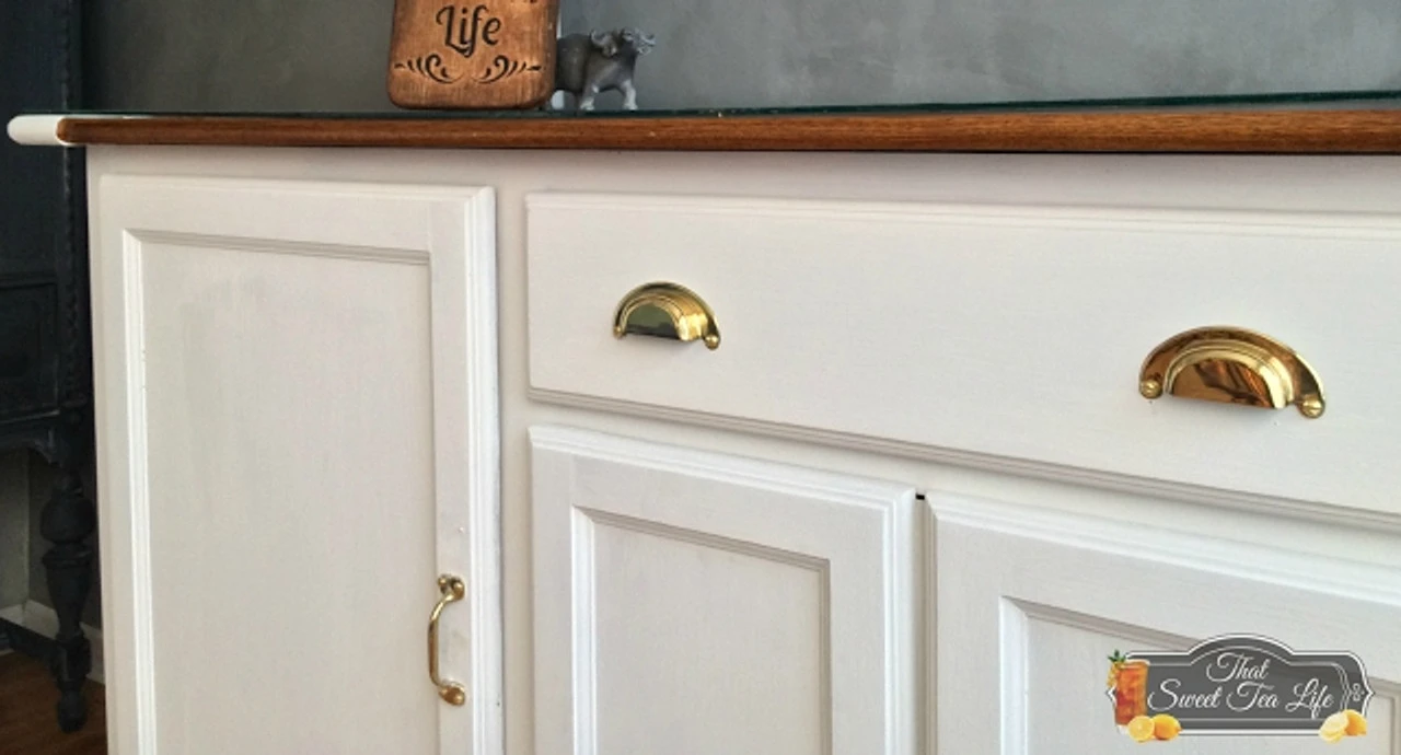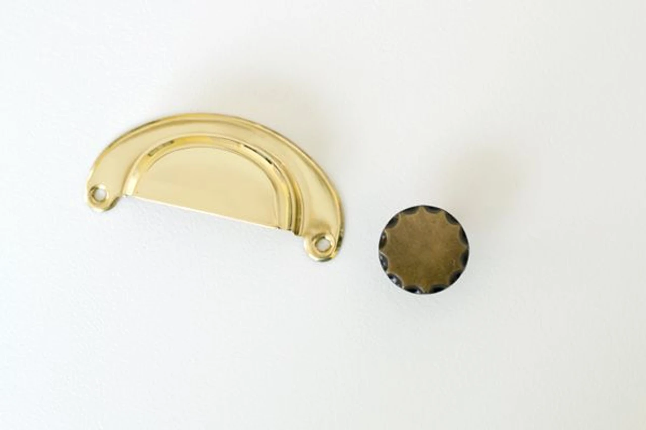 Solid polished brass cup pull, Hoosier style. This cup pull is not only a great replacement pull for Hoosier hutches, it will add a country or utility look to any drawer or door. Pull is an exact reproduction of old Hoosier pulls. It is Stamped from sheets of solid brass just like the old ones. This beautiful brass cup pull was recently used alongside an antique copper knob (AM-TN497ABS) on a white credenza makeover on the DIY blog Sarah M. Dorsey Designs as seen in the additional images. The group shot of this cup pull and the white ice box style project with matching hardware from our Hoosier section comes from That Sweet Tea Life. Link to full length article in the Technical Information.
