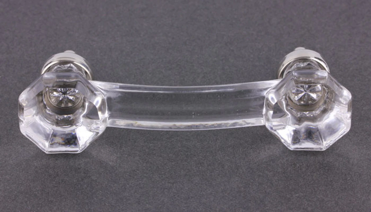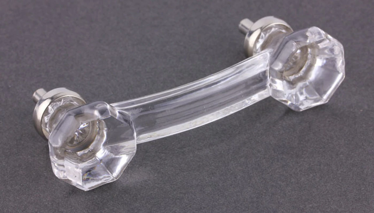 Antique Clear Glass Pull Overall 4 1/8″ Long x 1 1/4″ Tall – 3″ center-to-center. 1/2″ extends beyond back of pull for fastening. Knobs on ends are 1 1/16″