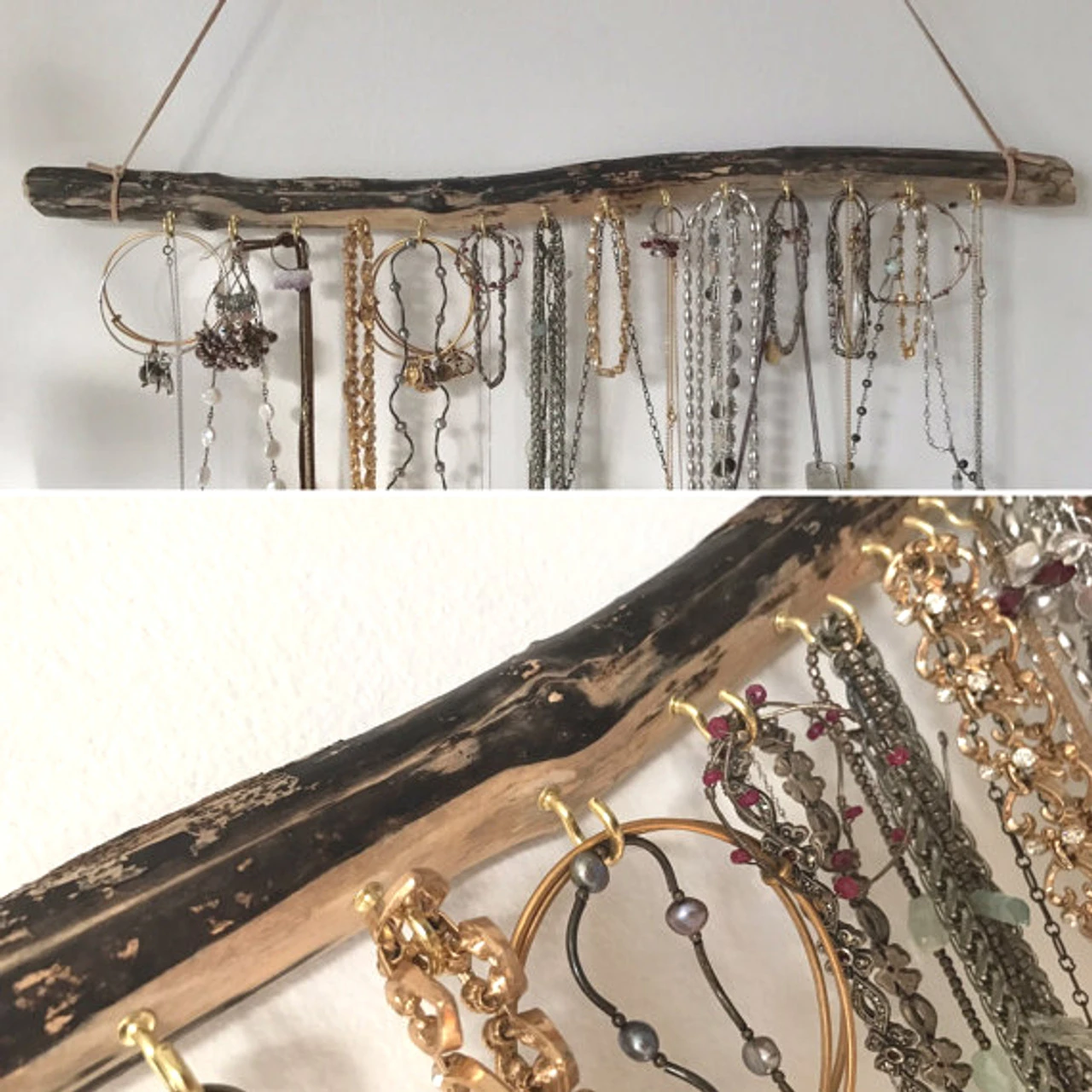 Cup Hooks – Box of 100 Pieces Hook Bright Brass Plating Screw Tip Base This hook would be appropriate for a wide range of uses. Hook is measured from the shoulder to the bottom which equals 5/8″. In the additional images you can see these hooks in use from a customer we are proud to have in Curiographer! This highly rated Etsy shop sells the driftwood jewelry racks pictured as well as other unique items. From their store, “Natural driftwood turned effortless jewelry display and storage. These pieces look beautiful hanging on a wall or hook. These wall mounted displays make for beautiful bohemian necklace organizers. Makes a great gift for her (or you).”