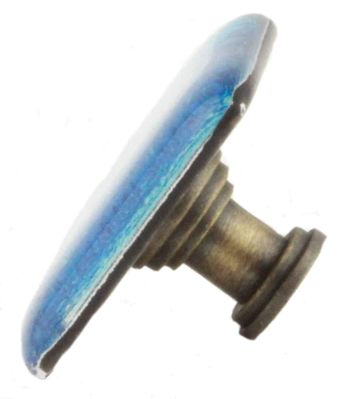 From the kilns of Design Studio 180 these fused glass knobs are created by cutting and stacking art glass in layers. The glass used is specially produced to have equal expansion and contraction characteristics so that the layers do not break when cooled. Then, these stacks are fired at precise temperatures and timings involving up to 10 different temperature steps. Then rapidly cooled from nearly 1500 to 1000, and annealed for 8 to 12 hours. At this point, the formerly separate layers of glass are molecularly bonded into a single piece of fused glass. Each knob is individually handcrafted and there will be slight variances in shape and on the edge where the layers of glass meet. This knob features a dark mirrored back that reflects a blue light wonderfully.