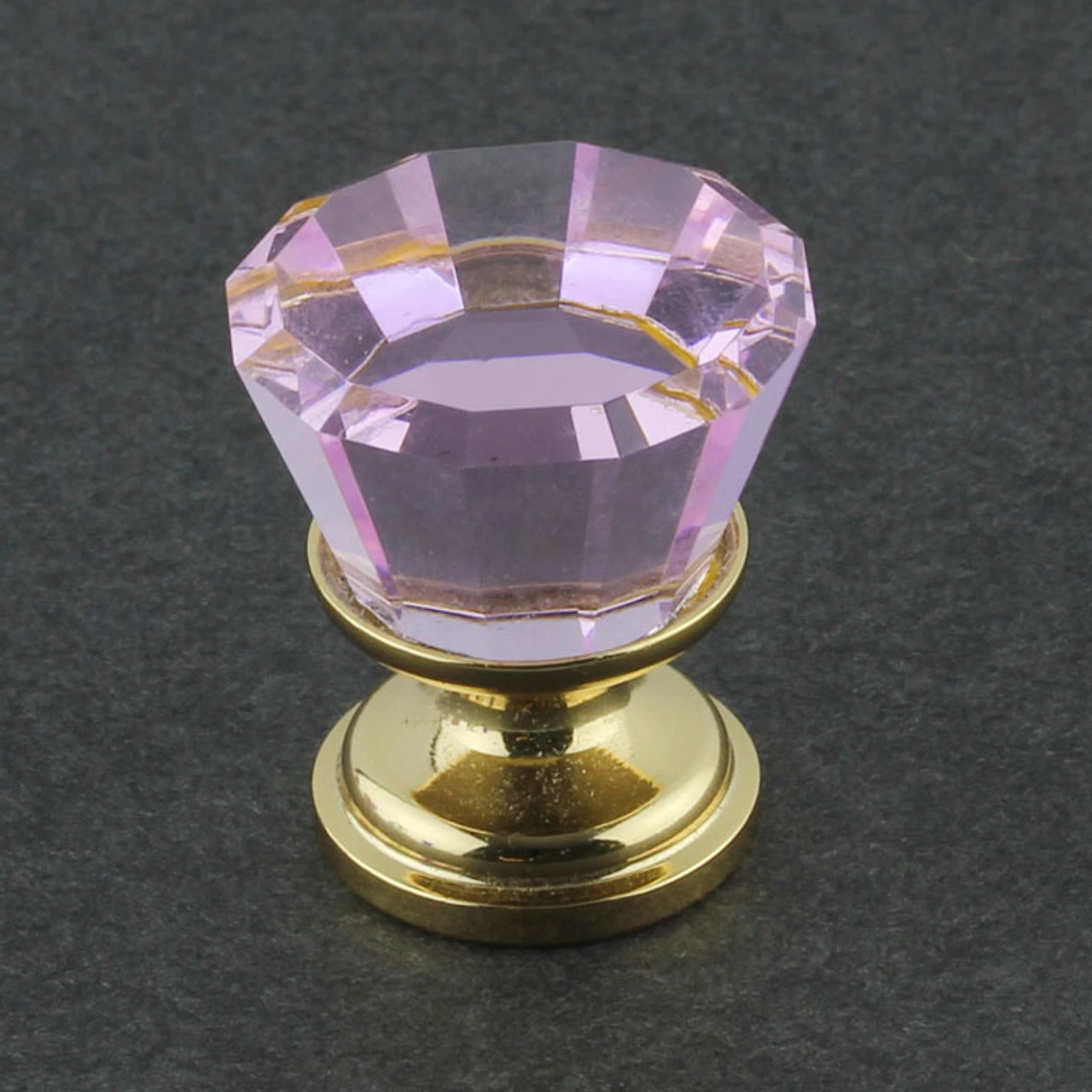 A Pink Cut Crystal Knob with facets cut so cleverly that the interior looks like a pink mirror. 24K gold plated base, comes boxed.