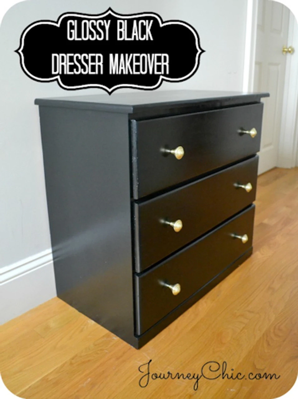 This satin brass knob from Amerock is from the Abstractions Collection. Recently this knob was featured in the home and DIY blog Journey Chic. You can see that the satin brass looks great on the glossy black dresser in the additional images.