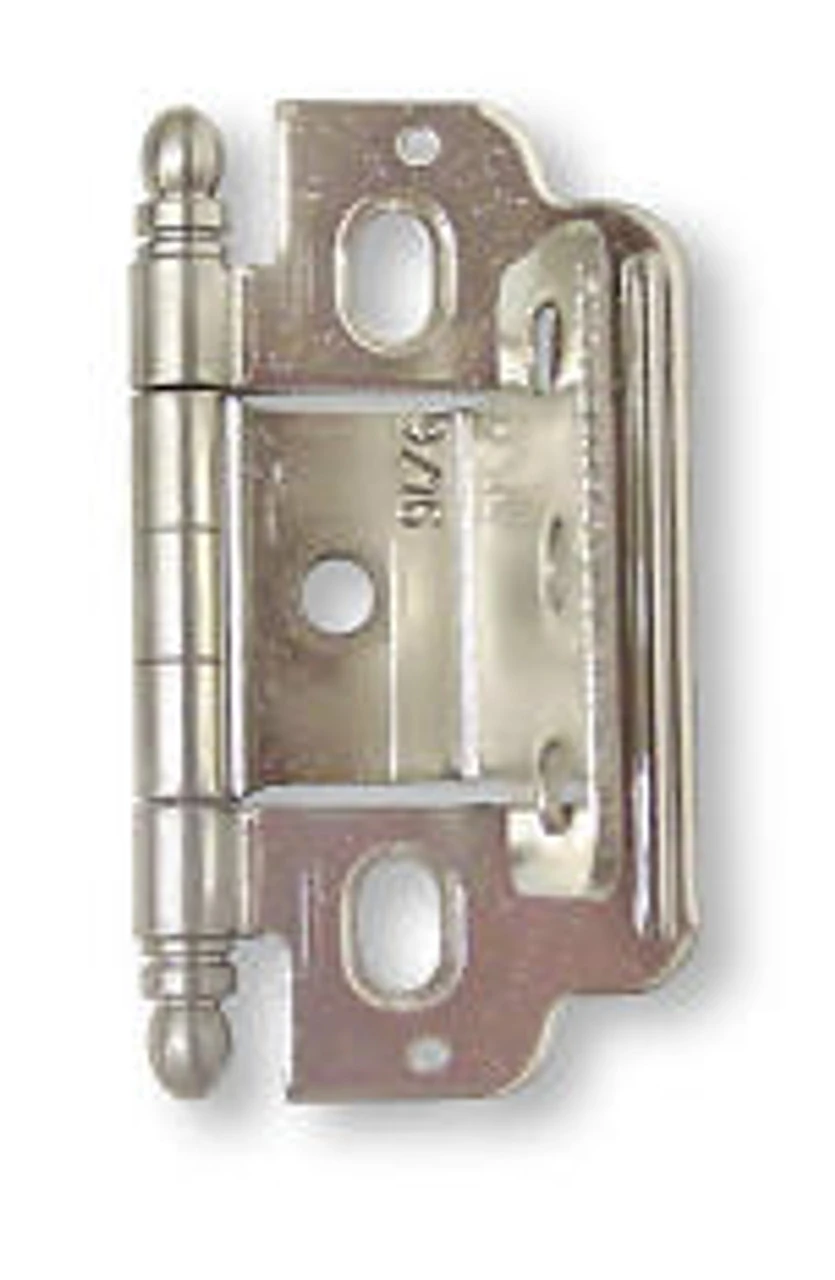 Premium sterling nickel non-mortise wraparound hinge. This is a non-mortise, partial wrap-around (wraps around the back of the door for extra support) with decorative ball finials. This hinge is for a 1/2″ door mounted flush to a face frame style cabinet. The hinge has 4 adjustable slots for screws and comes with the screws necessary for mounting. The hinge can be adjusted using the slotted screw holes and locked into place using the non-adjustable slots. This hinge is for use on a face-frame style cabinets. Not for inset or overlay doors or for frame-less cabinets. Think butt hinge with extra support, and you’ll understand how this hinge functions.