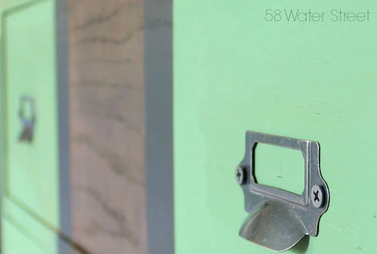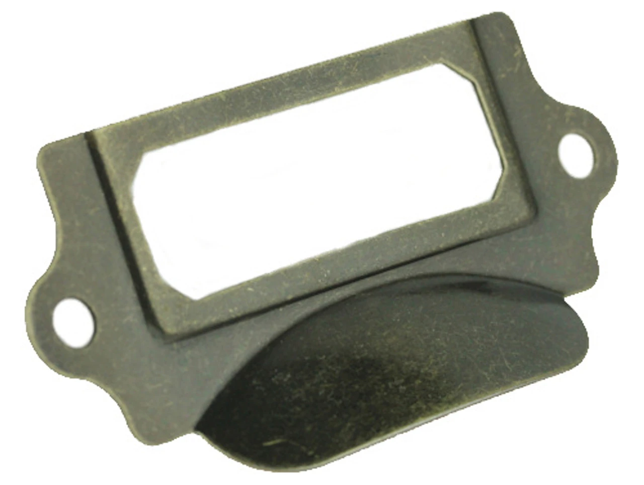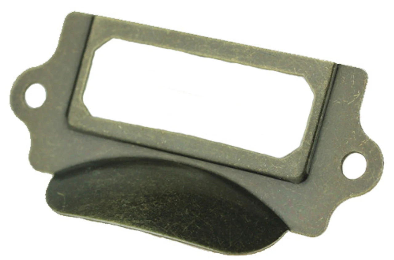 This classic antique brass label holder is identical to those used on old office filing cabinets. The cup pull allows this piece of hardware to do double duty as a label holder and a way to open your drawer. This label holder is very popular as well and the additional images are from the DIY blogs Bless’er House, Joy in our Home, Sawdust 2 Stitches, 58 Water Street, as well as Ginger & the Huth.