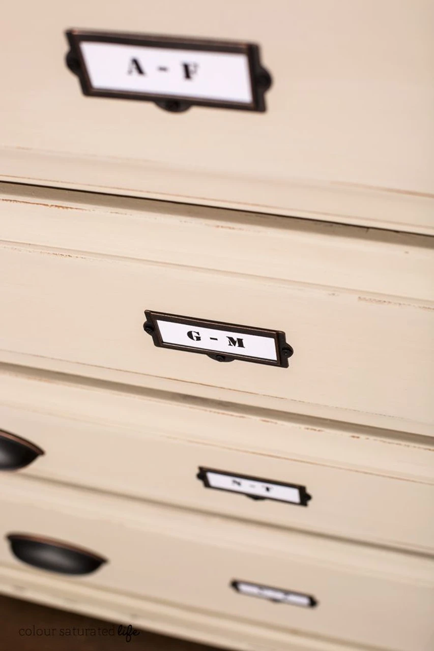 This standard metal label holder is just like the ones used on old office filing cabinets. Lately a lot of people have been using these for scrap booking and organization around the house. This particular style and finish was recently used on the DIY and home decor blog Petal & Ply on an IKEA cubby hack as seen above. The middle pictures show a nice craft cabinet makeover from Ginger Snap Crafts. In the images our antique copper ceramic pull (C-204-6-96-BCR) match this label holder perfectly! Also used more recently at the great furniture makeover blog Colour Saturated Life. In the additional images this label holder is paired with Venetian bronze knobs (L-61780VB) and cup pulls (L-61341VB).