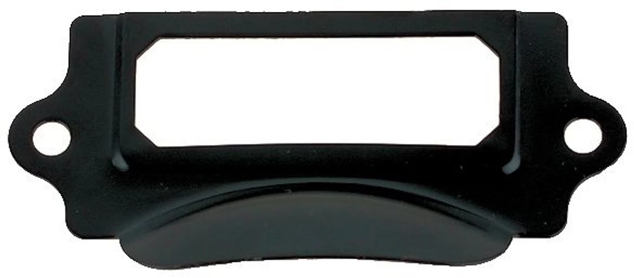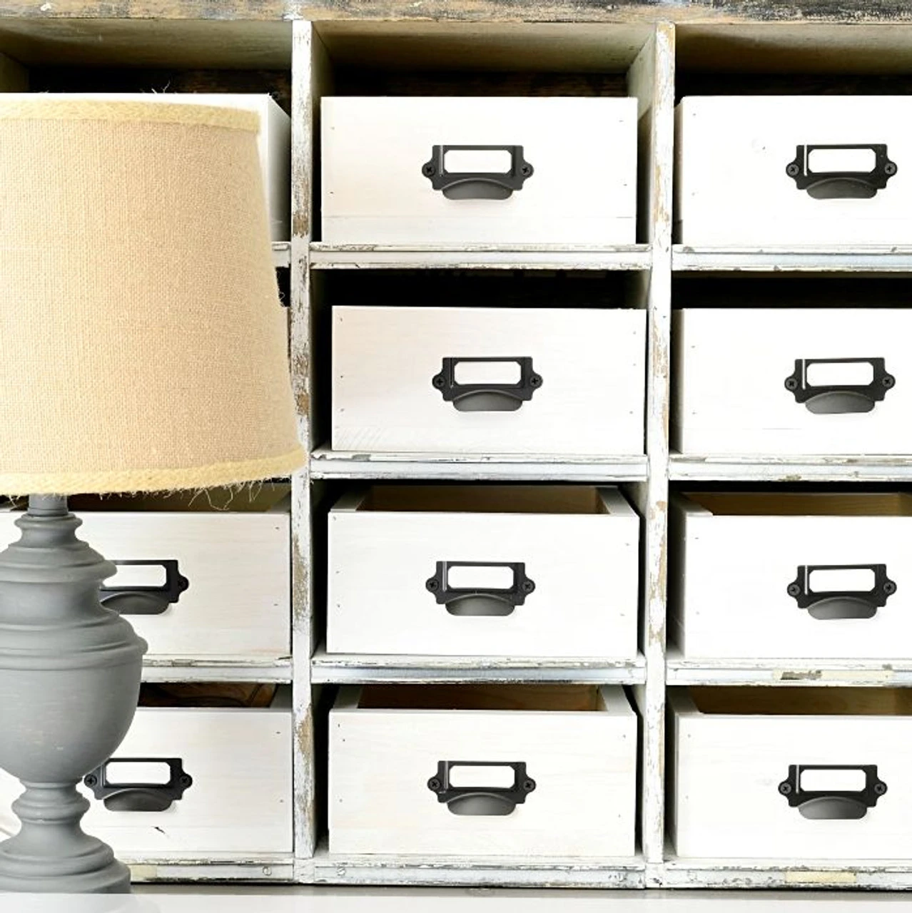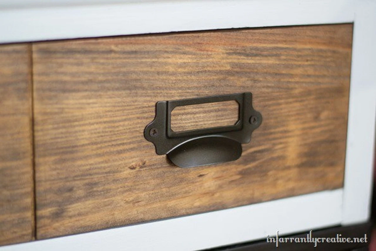 This cup pull label holder is perfect for office filing cabinets or drawers at home. The cup pull allows this brass label holder to do double duty as a label holder and a drawer pull. This simple black label holder is extremely popular as seen in the additional images from projects by Elisha at the DIY blog Pneumatic Addict, Dandelion Patina, Beckie at the blog Infarrantly Creative, and Bless’er House. Elsiha’s projects shows the versatility of these little cup pulls. She used a combination of black primer and aging dust to take the “brand new” look off of them and lend a rustic look to her project.