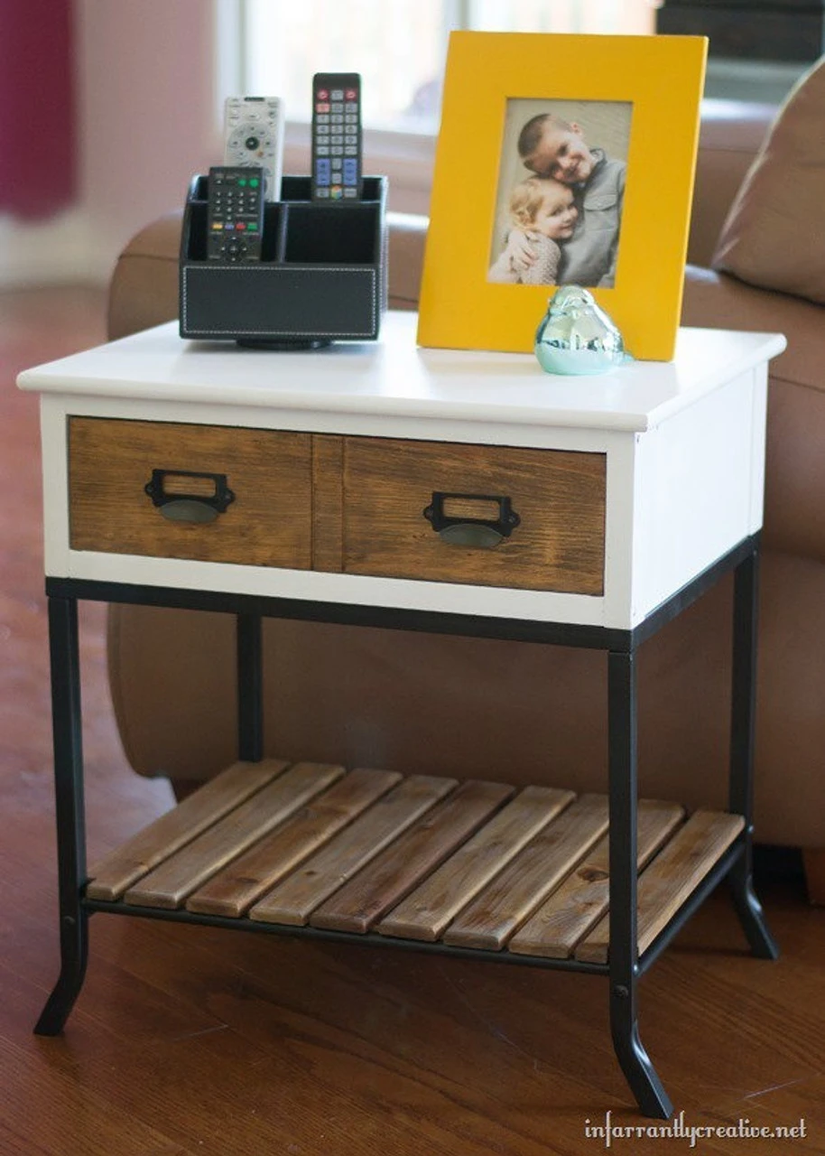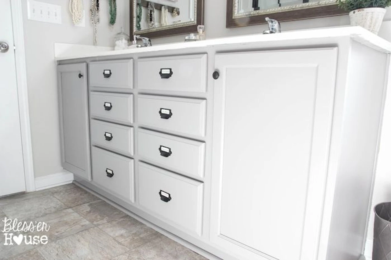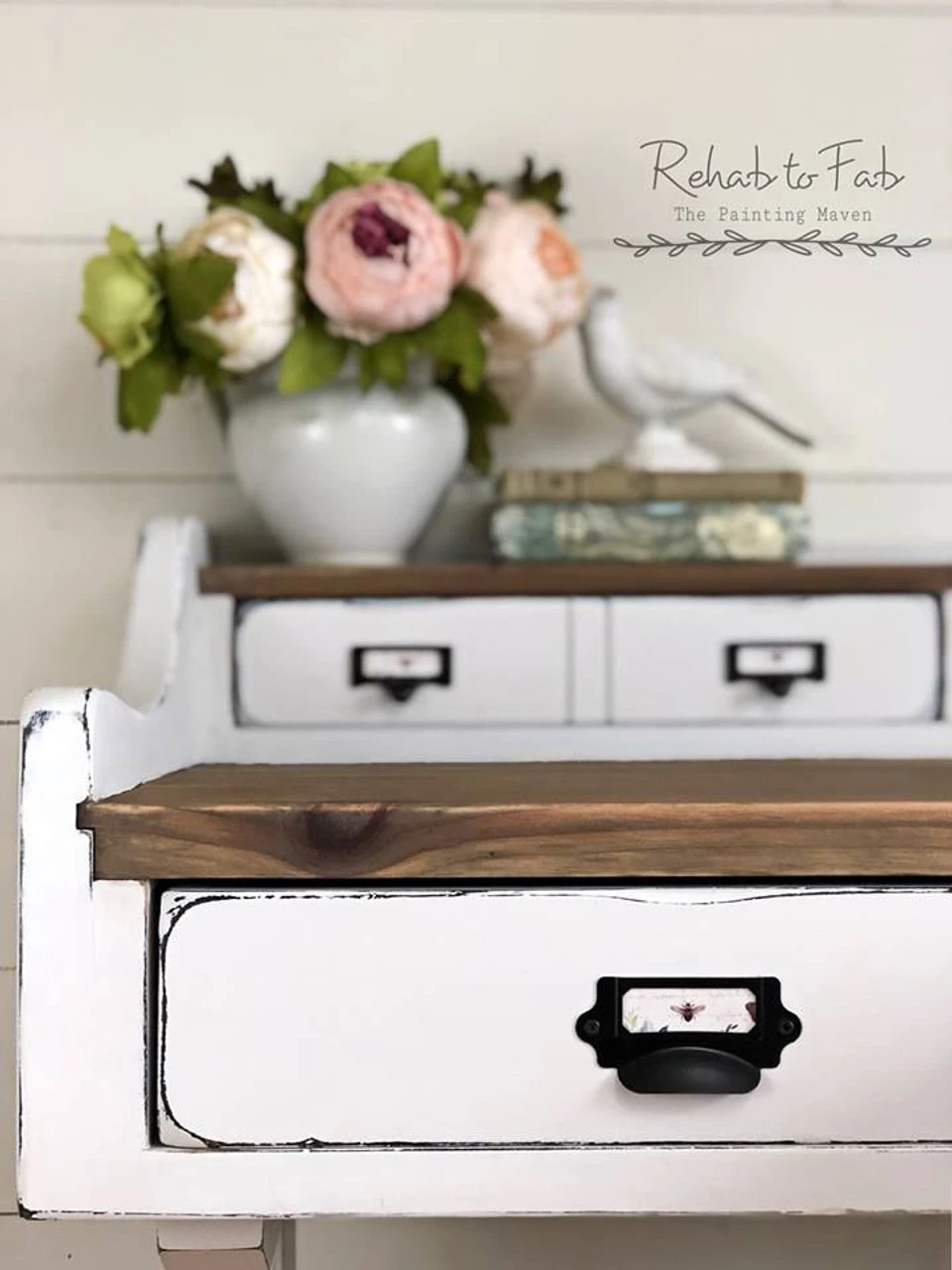 This cup pull label holder is perfect for office filing cabinets or drawers at home. The cup pull allows this brass label holder to do double duty as a label holder and a drawer pull. This simple black label holder is extremely popular as seen in the additional images from projects by Elisha at the DIY blog Pneumatic Addict, Dandelion Patina, Beckie at the blog Infarrantly Creative, and Bless’er House. Elsiha’s projects shows the versatility of these little cup pulls. She used a combination of black primer and aging dust to take the “brand new” look off of them and lend a rustic look to her project.