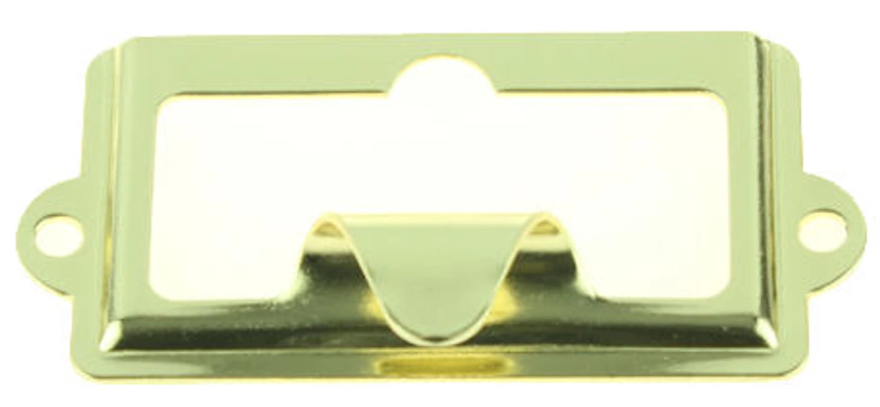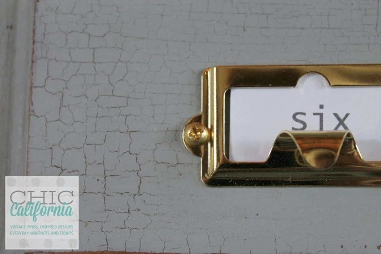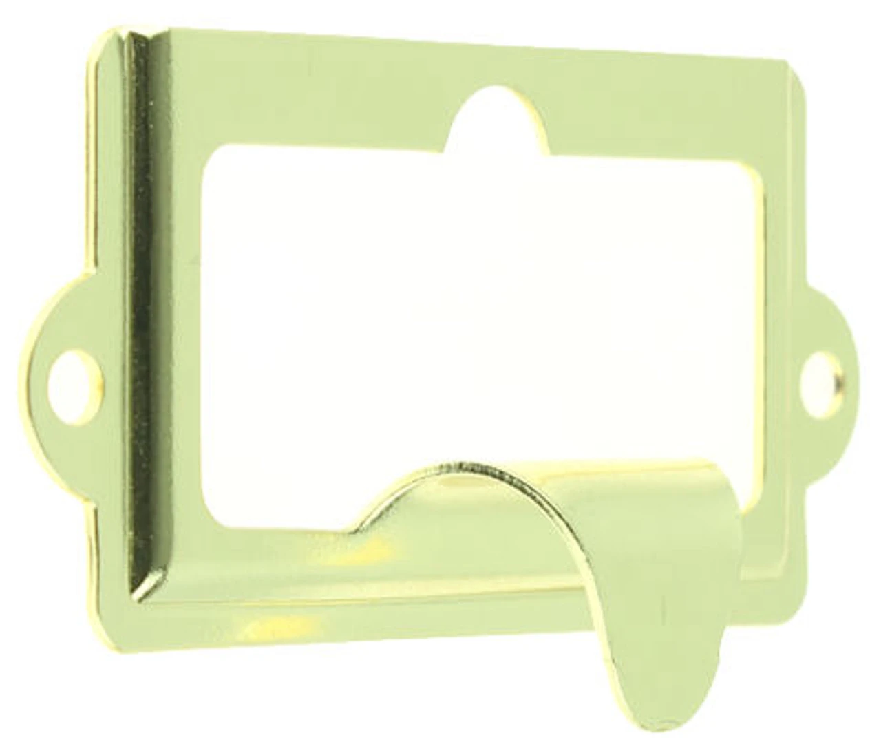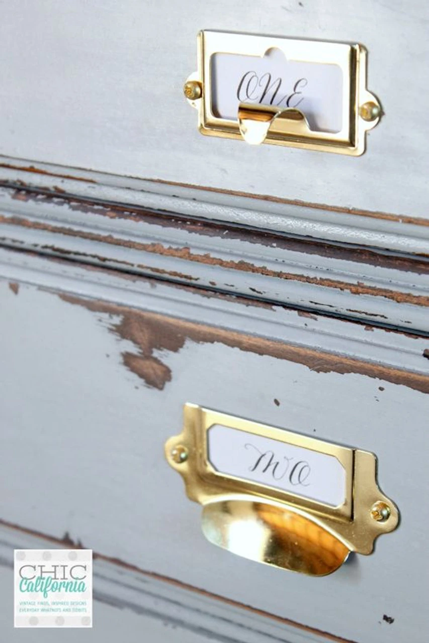 This brass plated cabinet label holder is the type used on old office file cabinets. Nowadays people use them to label all sorts of stuff at home and at the office. The finger pull allows the label holder to take care of two things at once. Recently used in tandem with our brass cup pull label holder at the DIY and furniture makeover blog Chic California as you can see in the additional images. Used more recently at Anastasia Vintage alongside Unicorn Spit paint on a truly unique curbside find desk makeover. And another great project from Rehab to Fab on a beautiful mustard chest with matching brass labels.