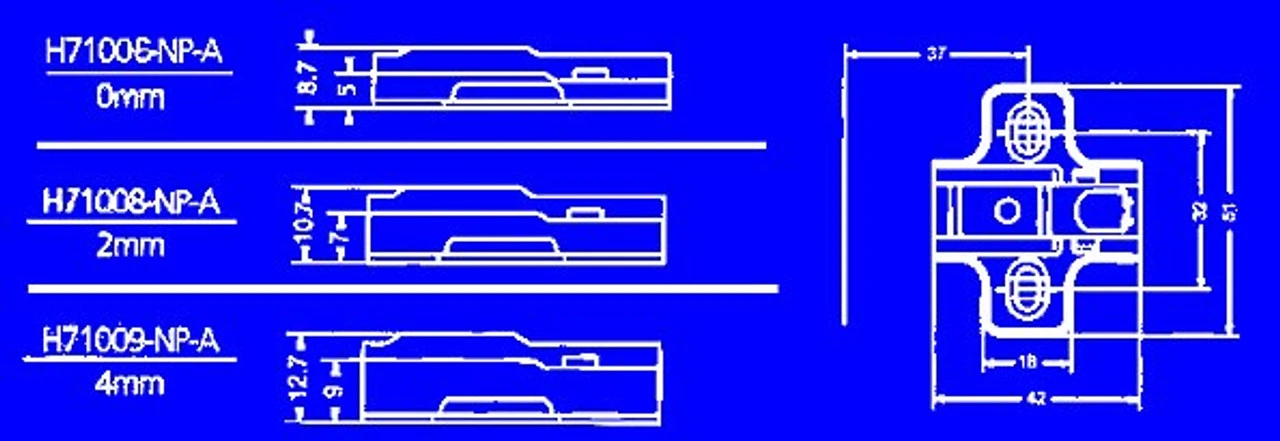 Plate is 8.7mm tall or 6/16″ approximately. Same as H71006-NP-A but has screws