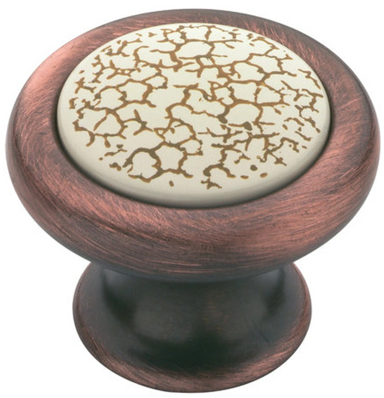 38.5mm Ceramic Insert Knob Satin Bronzed Copper/Crackle Ivory Liberty Hardware lends us this guiding statement: “These harmoniously proportioned pieces add luxurious appearance to cabinetry by blending design distinction and Euro elegance with subtle contrasting traditional style.” We just know that whoever this Francesca person is, we like her style.