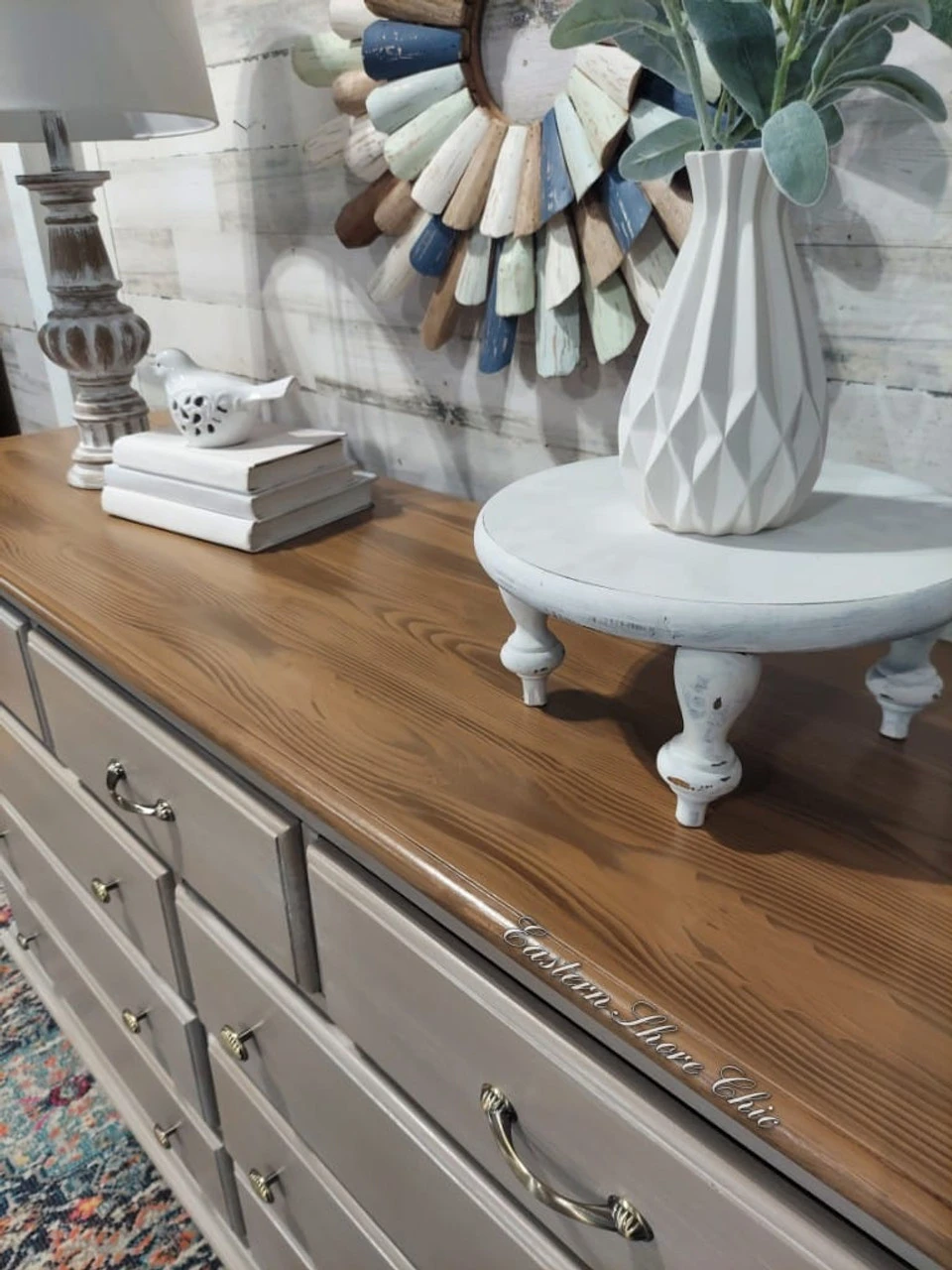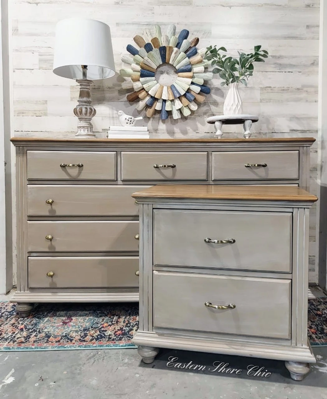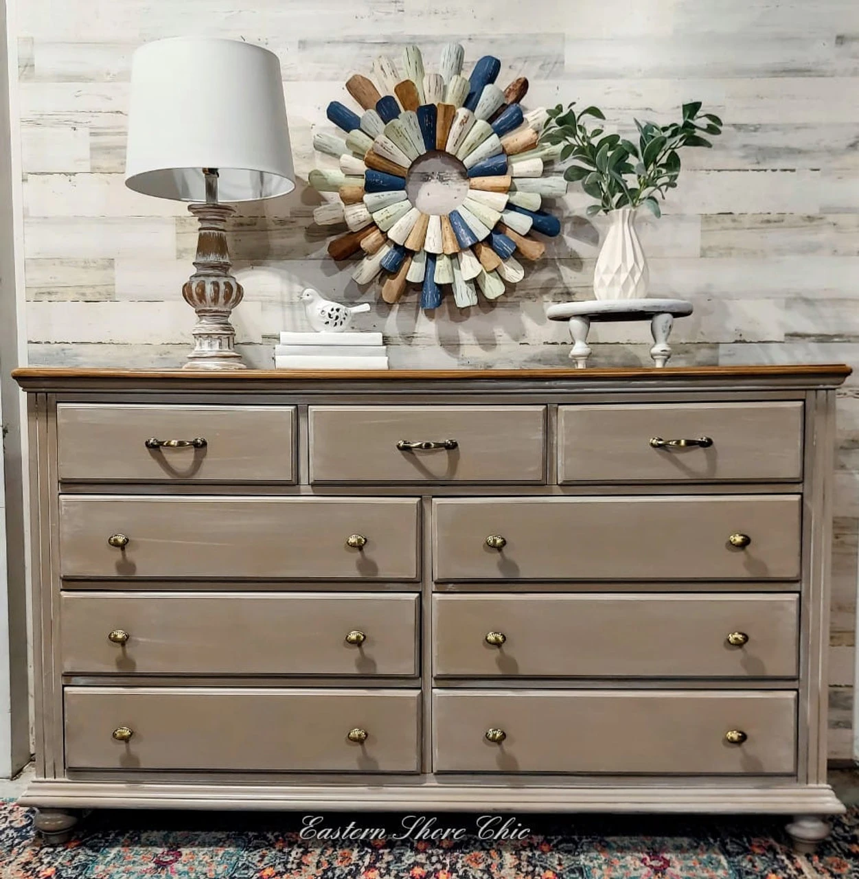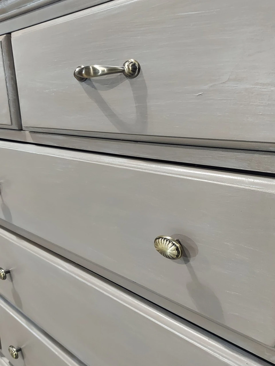 This antique brass pull and the matching antique brass knob were used on a set of dressers by Eastern Shore Chic in the addtional images. Here is a link to the matching antique brass pulls.