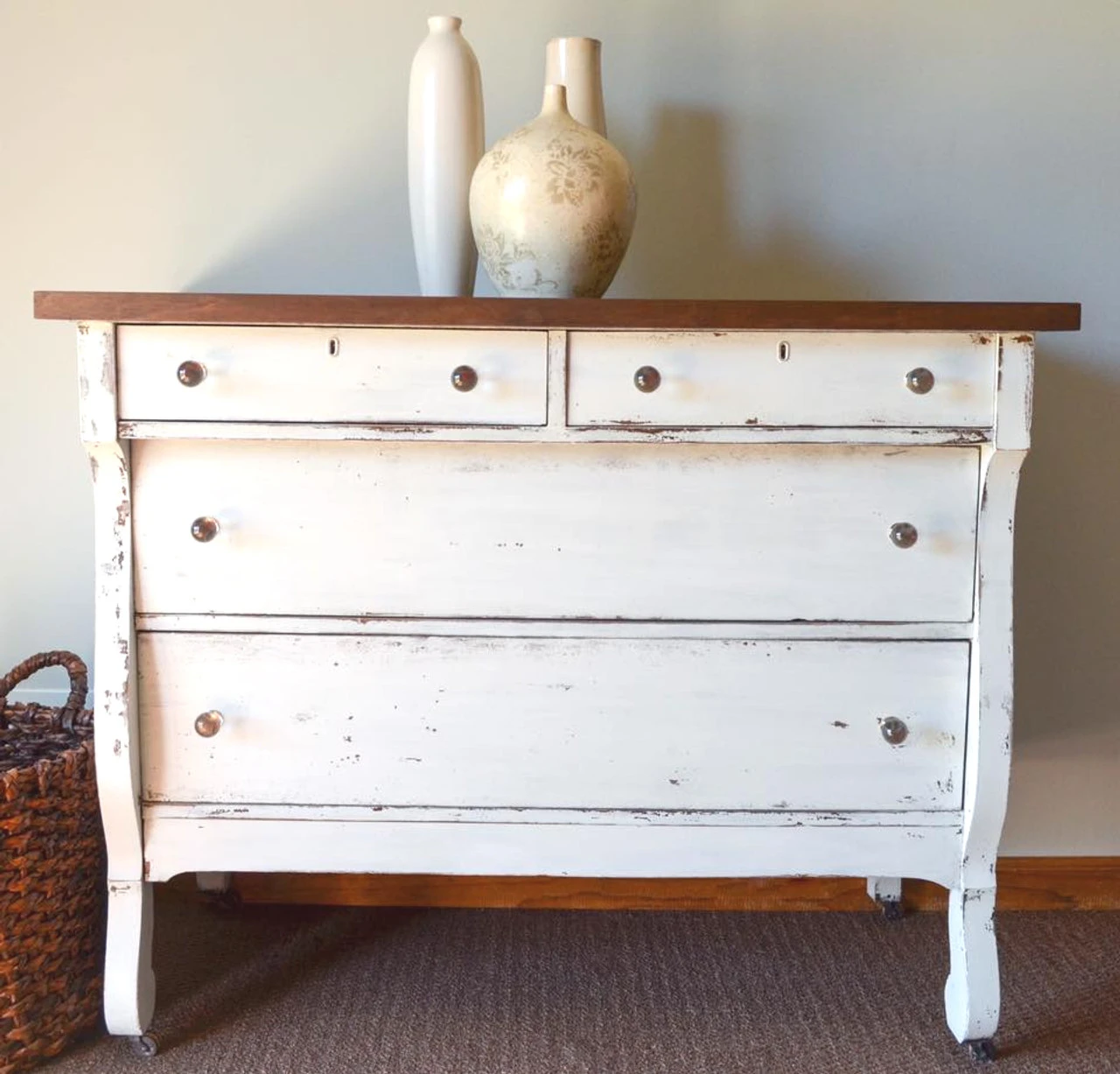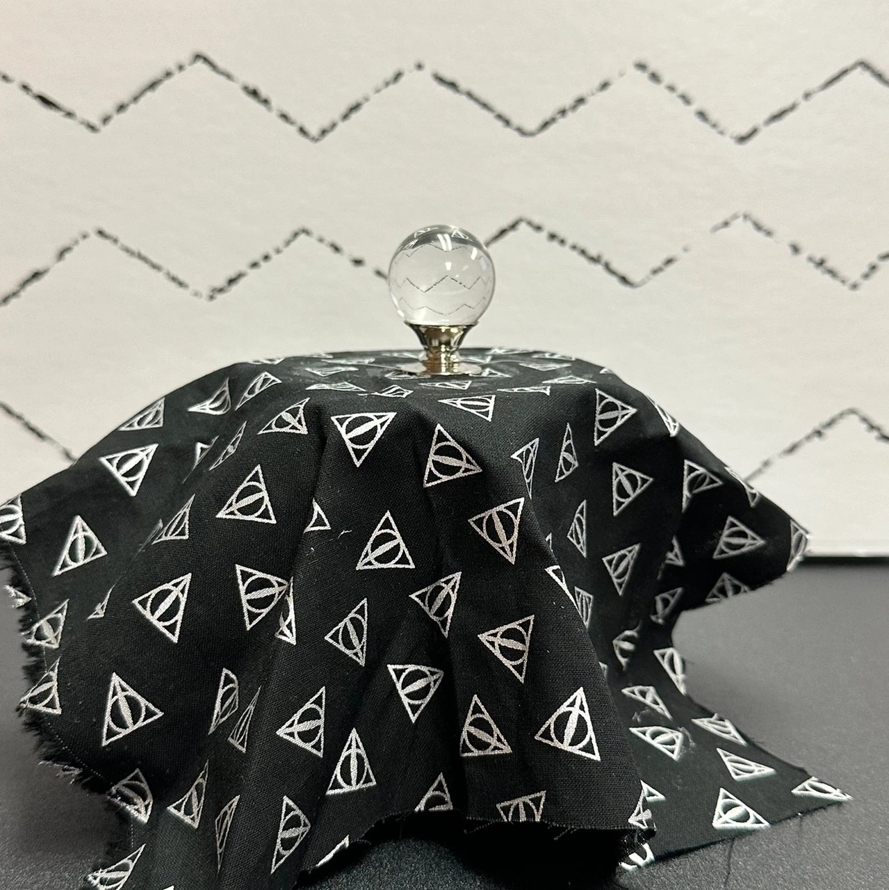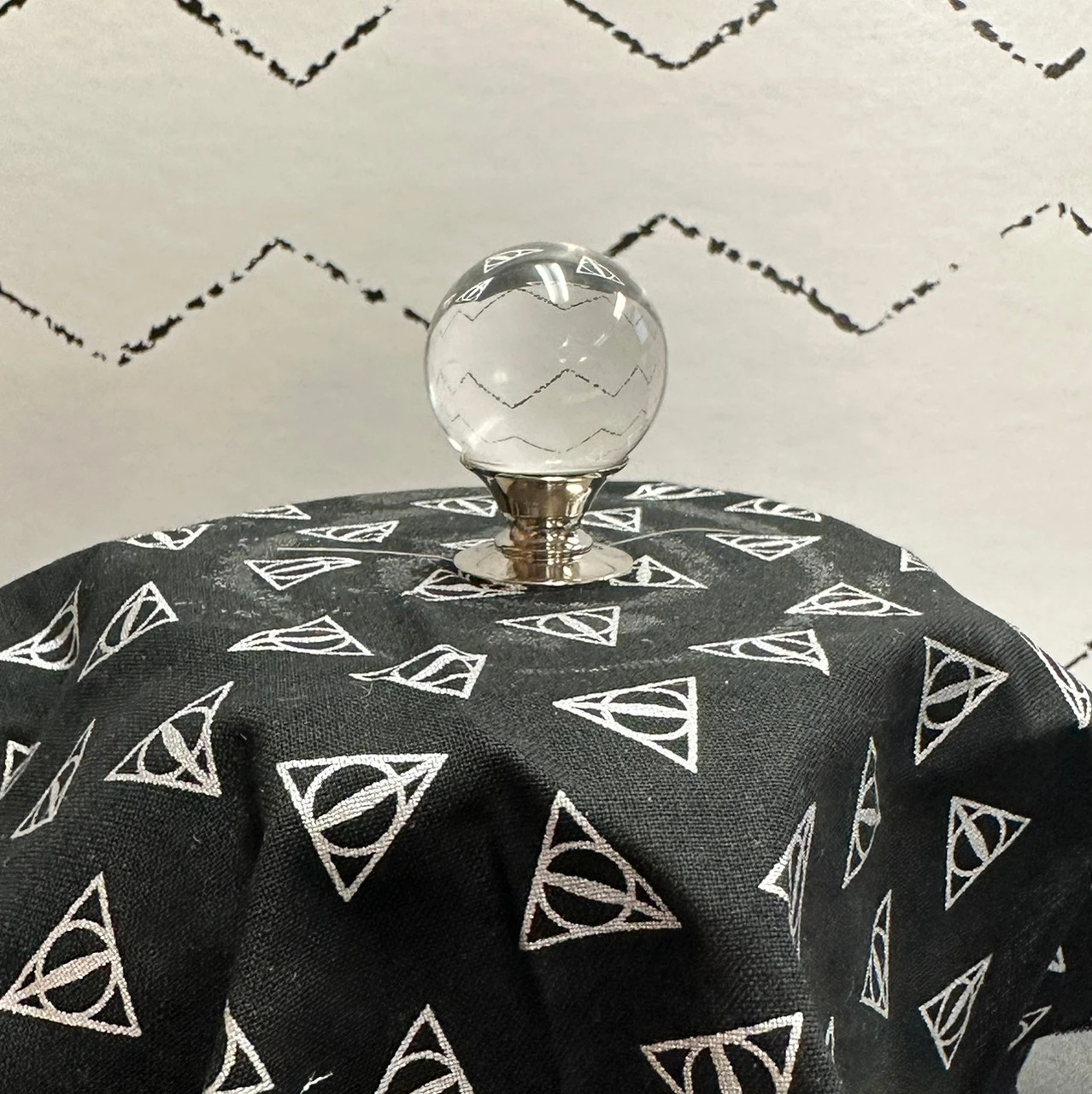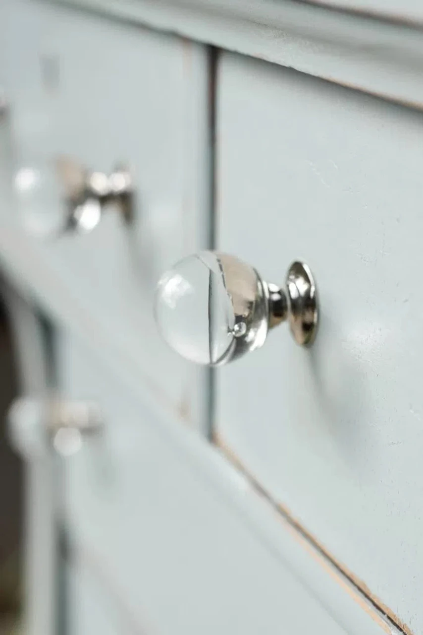 Beautiful Crystal Ball Mounted on Polished Nickel. Polished Nickel is a great match for other chrome hardware. The blue dresser and the beautiful shots of this knob on the dresser come from Cassie Bustamante! And the big cabinet is from Grace on Broadway! The last 3 pictures are this knob used a crystal ball on “floating tables” for a halloween party. These knobs are perfect for traditional uses and non-traditiona uses. These are indeed exquisite glass knobs that will bring an elegant but minimalist touch to your decor. This knob is worth every penny of the $5.98 that it usually sells for, but we are seriously overstocked and are willing to offer you these great prices if you can find a place for these and help us out.