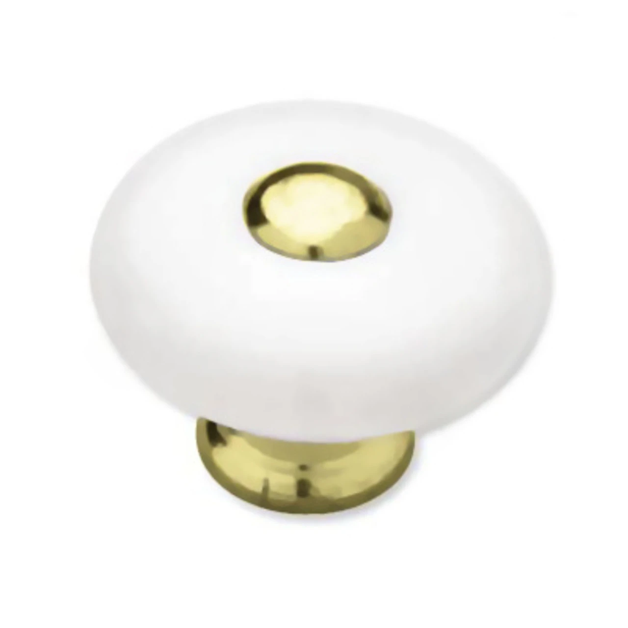 Classic Ceramic knob bright brass plated, 1 1/4″ flattened white ceramic knob.