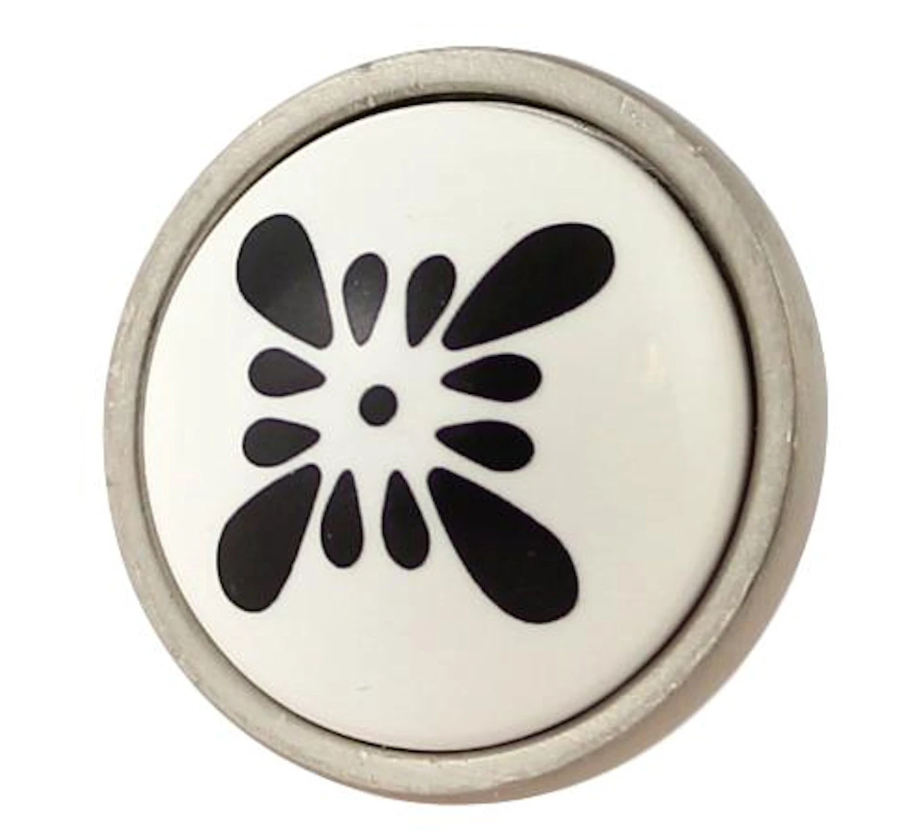 This knob is part of the Betsy Fields Cupboard Collection. In this knob a stylish brushed pewter base captures a stark white ceramic insert highlighted by a black traditional Dutch design. Nothing beats the crispness of contrast like black on white.