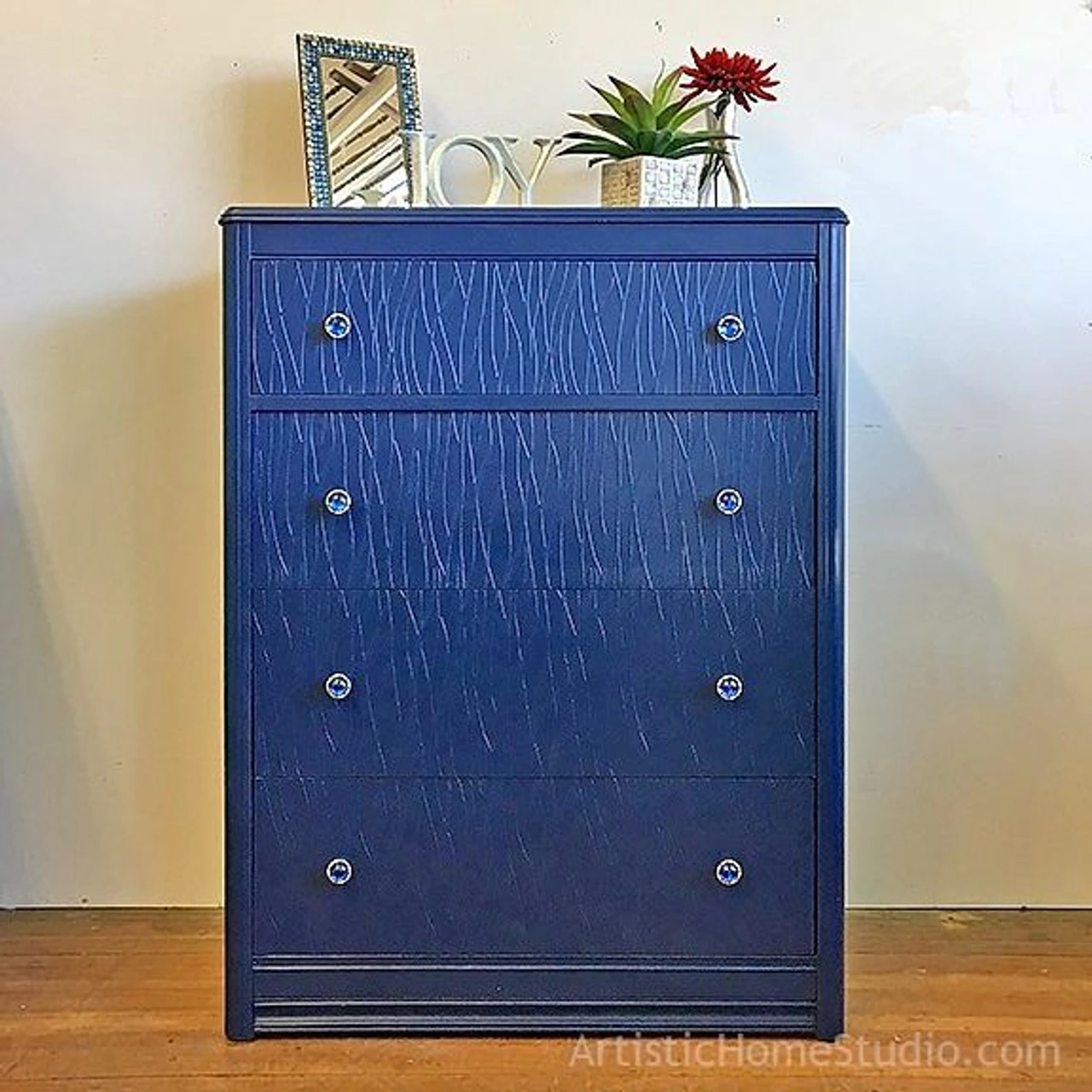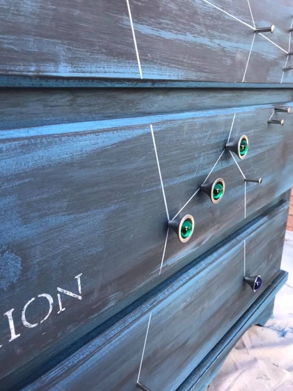 Yes, these are $13.00 glass designer knobs being offered for $3.50 !! Liberty Hardware originally introduced this line of art glass knobs at $16.00 in an attempt to reach a high end customer base. They were low volume sellers. Imagine that — a small number of people who can afford a sixteen dollar cabinet knob. Hmm-mm. So, we were able to purchase these at a great price and can now sell you an exquisite designer glass knob at an affordable price. This is the kind of deal we love to find and pass on to our customers. Gem Lilly Knobs were conceived to be part of a “step-up” category of products and are designed to appeal to fashion conscious buyers. These design conscious collections blend impeccable style and dependable performance. These knobs feature a combination of a naturally inspired metal base design and a beautifully cast jewel of solid Tiffany style glass. And a big thanks to Matthew at Combat Veterans Restoration and Rehab for sending in these pictures of a one of a kind dresser featuring Orion’s Belt made out of knobs and ferrules!