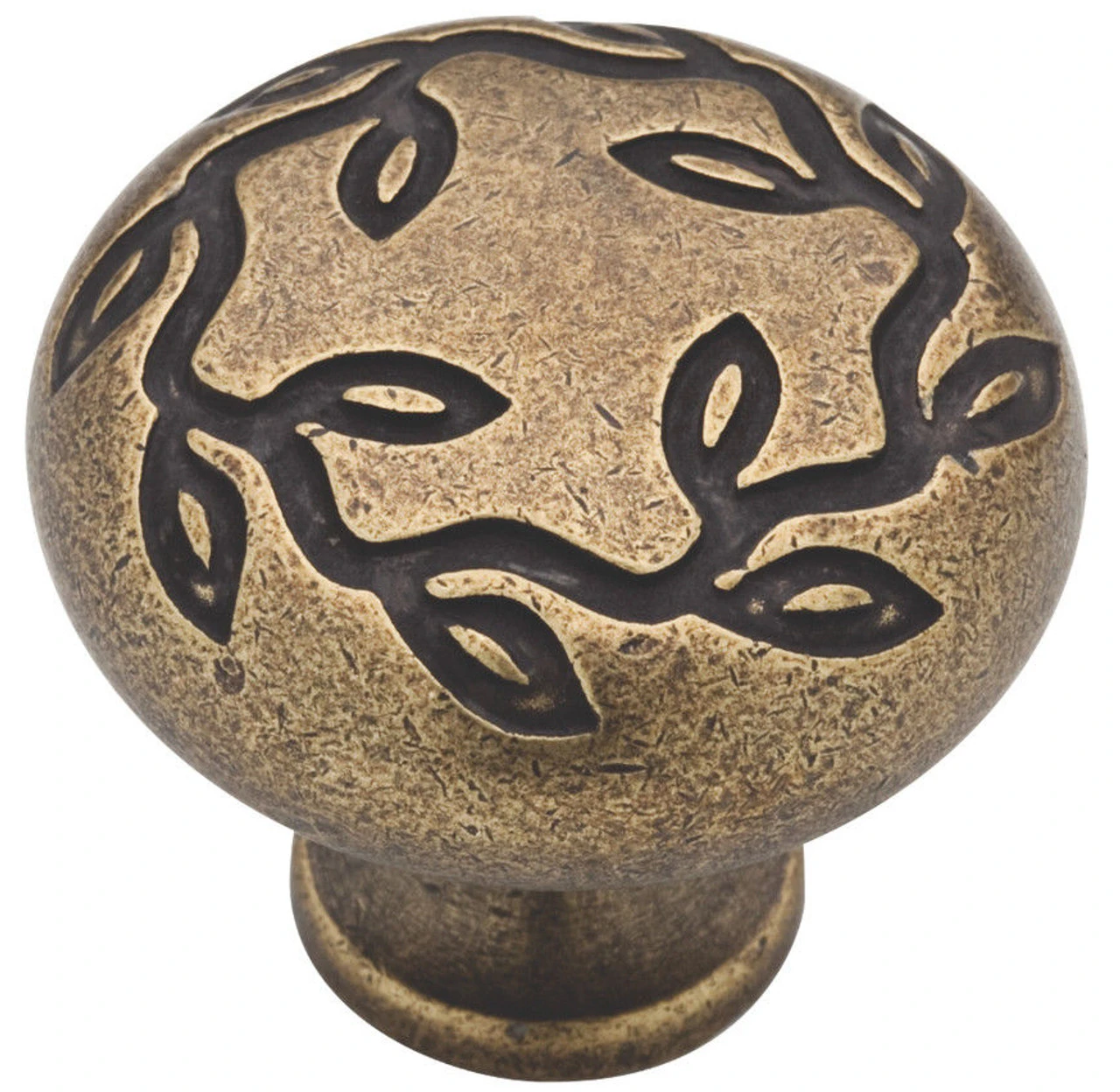 Antique brass round cabinet knob with intricate leaf and vine design.