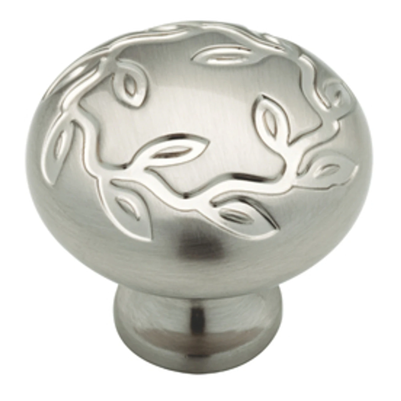 Satin nickel round cabinet knob with intricate leaf and vine design.