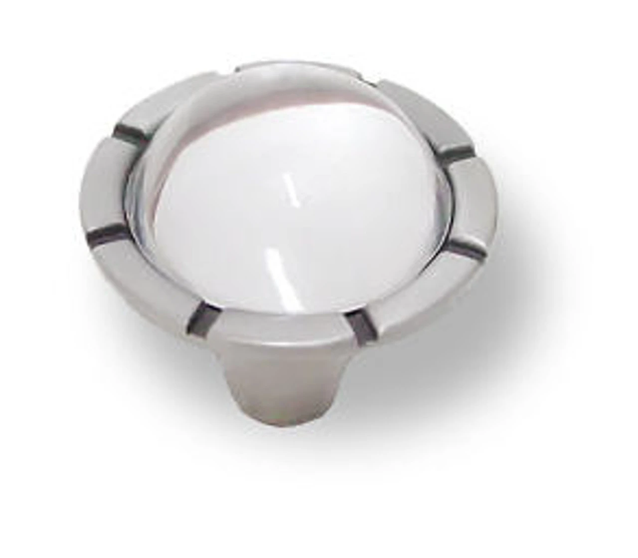 Yes, these are $13.00 glass designer knobs being offered for $3.50 !! Liberty Hardware originally introduced this line of art glass knobs at $16.00 in an attempt to reach a high end customer base. They were low volume sellers. Imagine that — a small number of people who can afford a sixteen dollar cabinet knob. Hmm-mm. So, we were able to purchase these at a great price and can now sell you an exquisite designer glass knob at an affordable price. This is the kind of deal we love to find and pass on to our customers. Gem Lilly Knobs were conceived to be part of a “step-up” category of products and are designed to appeal to fashion conscious buyers. These design conscious collections blend impeccable style and dependable performance. These knobs feature a combination of a naturally inspired metal base design and a beautifully cast jewel of solid Tiffany style glass. This clear glass knob has a mirrored bottom which enhances its look.