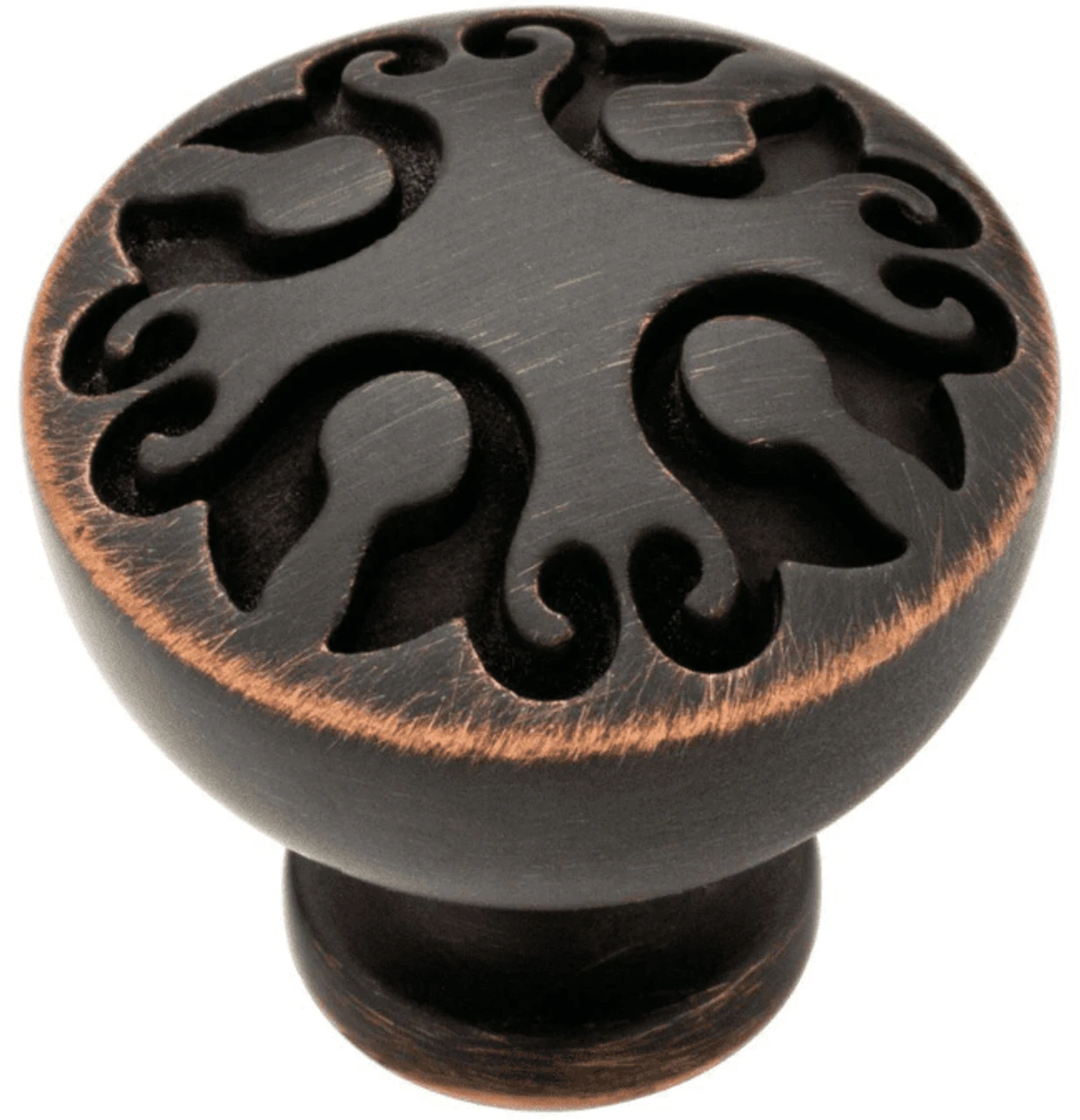 Rich, dark bronze finish with bright copper highlights Classic round knob shape with engraved design Includes two different screw lengths for your convenience Diameter: 1 1/8″ Comes with mounting hardware. Liberty Hardware
