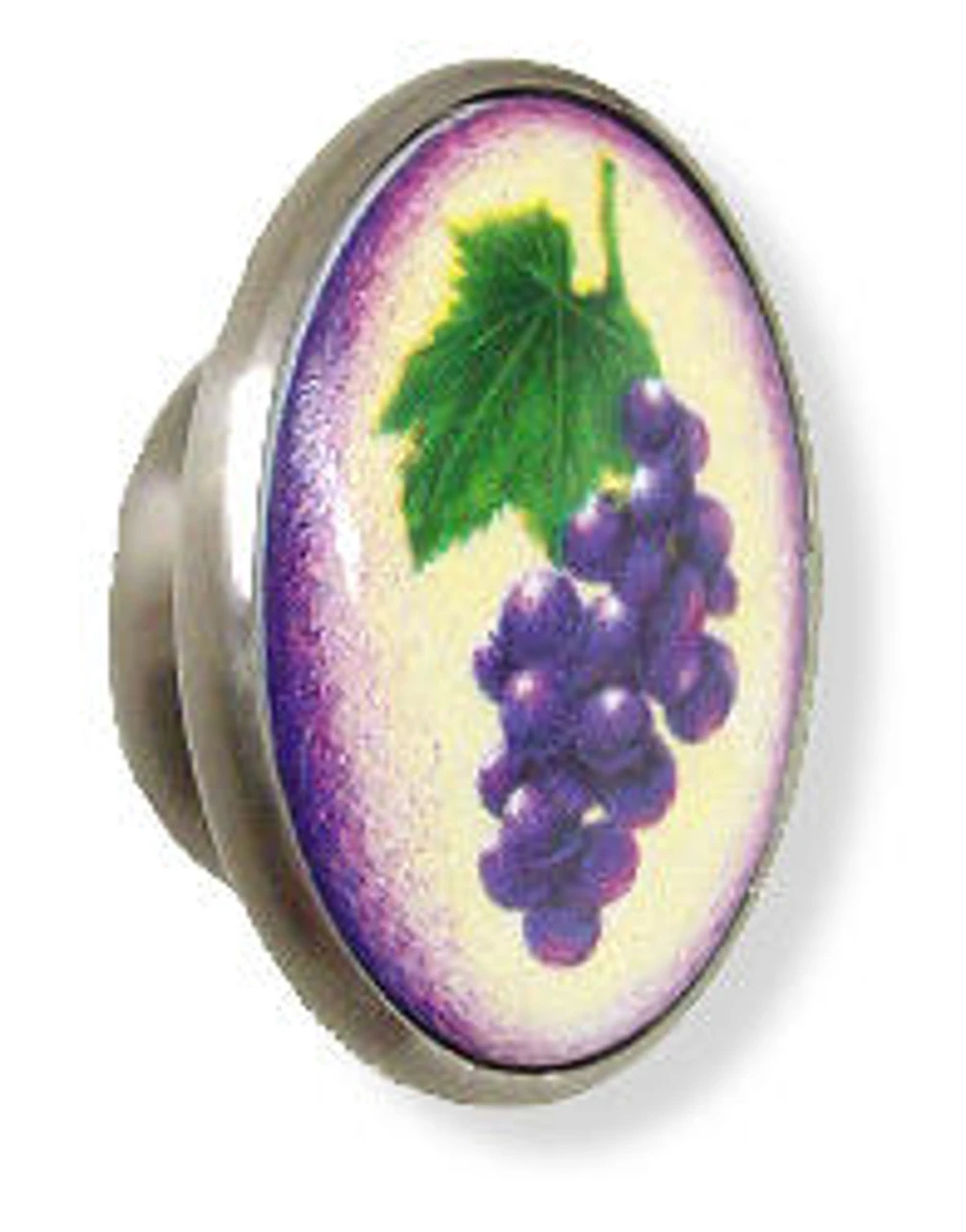 This beatiful satin nickel knob features a ceramic insert showing fresh grapes on the vine. Mix and match with the other fruit and vegetable knobs and pulls in this series.