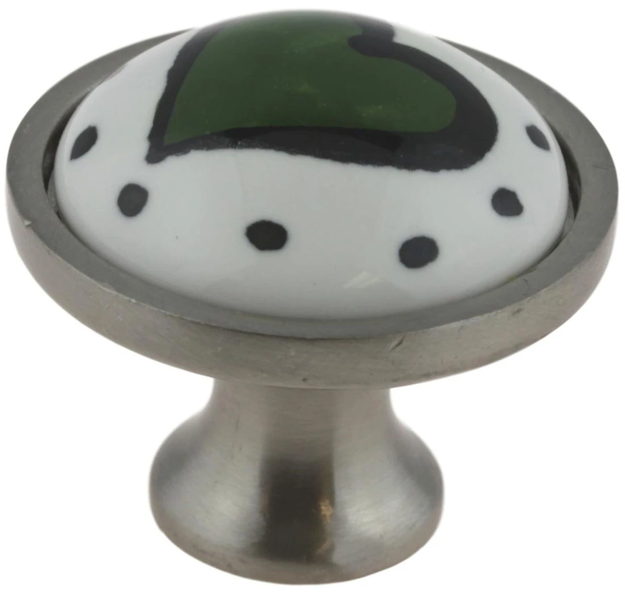 From Betsy Fields Design, this knob features a hand painted green heart design on a ceramic insert. The ceramic insert is set in a satin nickel base.