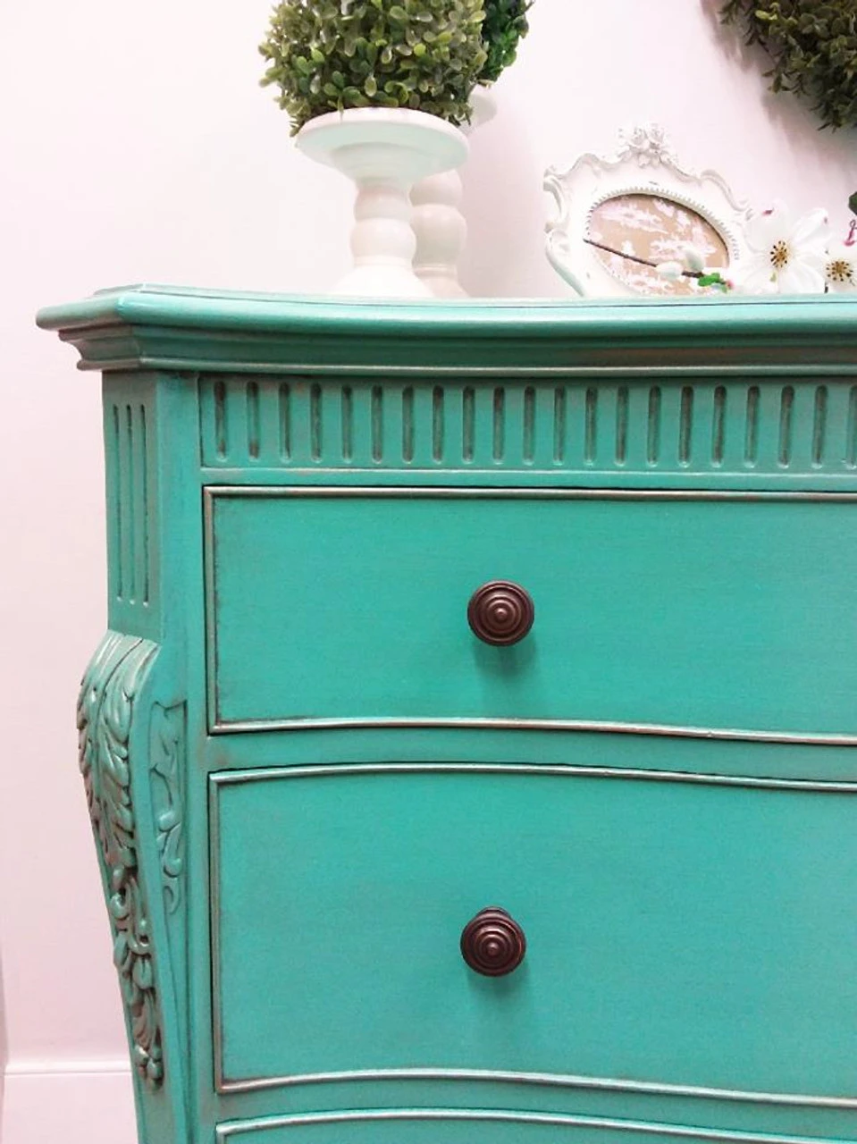 This modern design is a beautiful accent to any kitchen or bathroom furniture or cabinetry. Lucky us! Some lovely shots from Welcome Back Beautiful of this knob on a bright dresser makeover with some great wood detail!