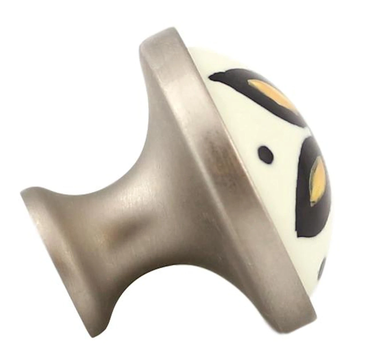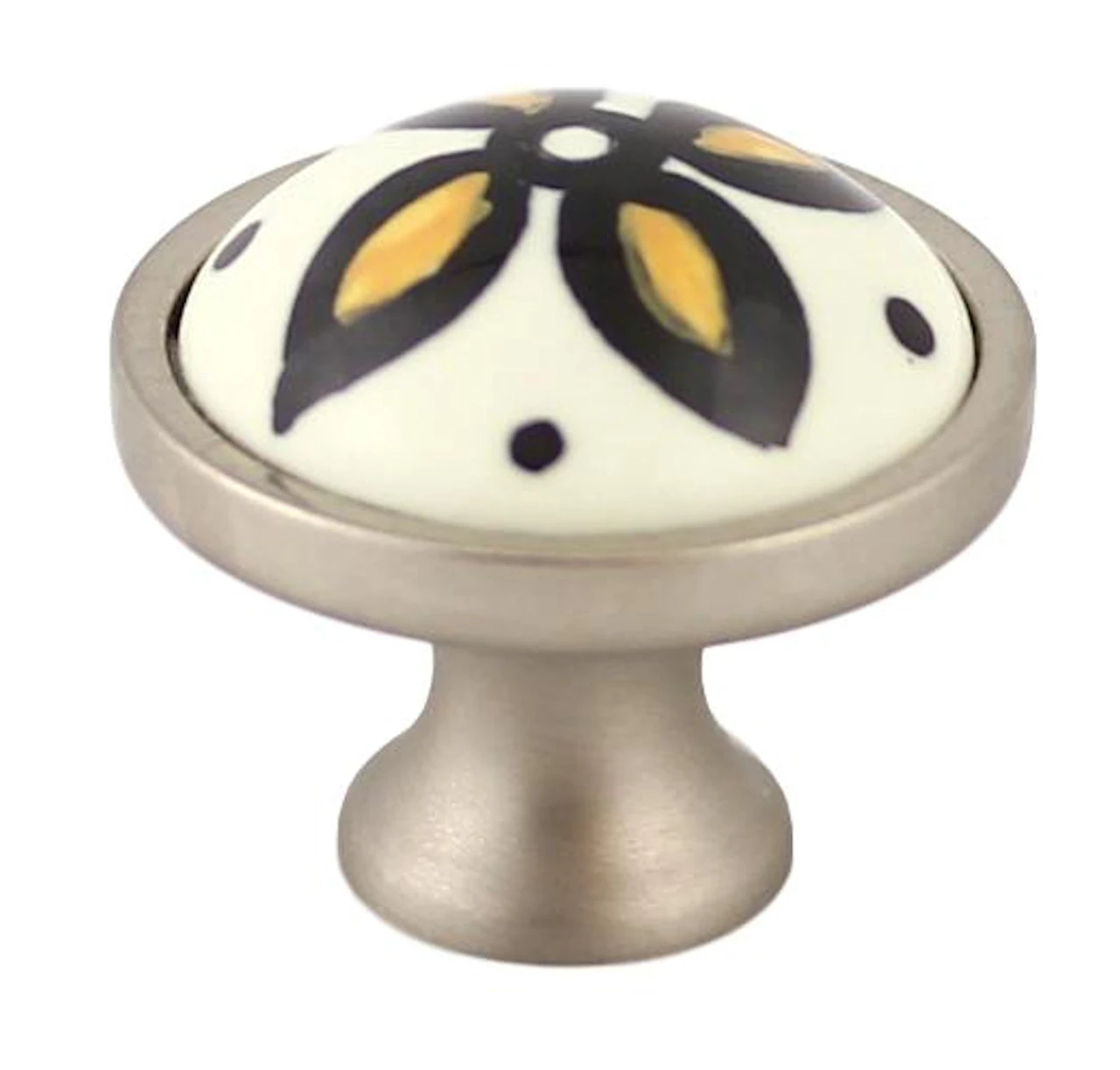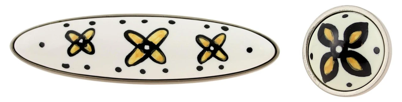 This whimsical knob features a hand painted yellow flower design on a ceramic insert. The ceramic insert is set in a satin nickel base.