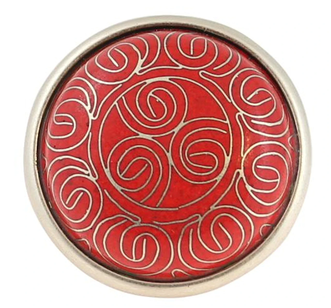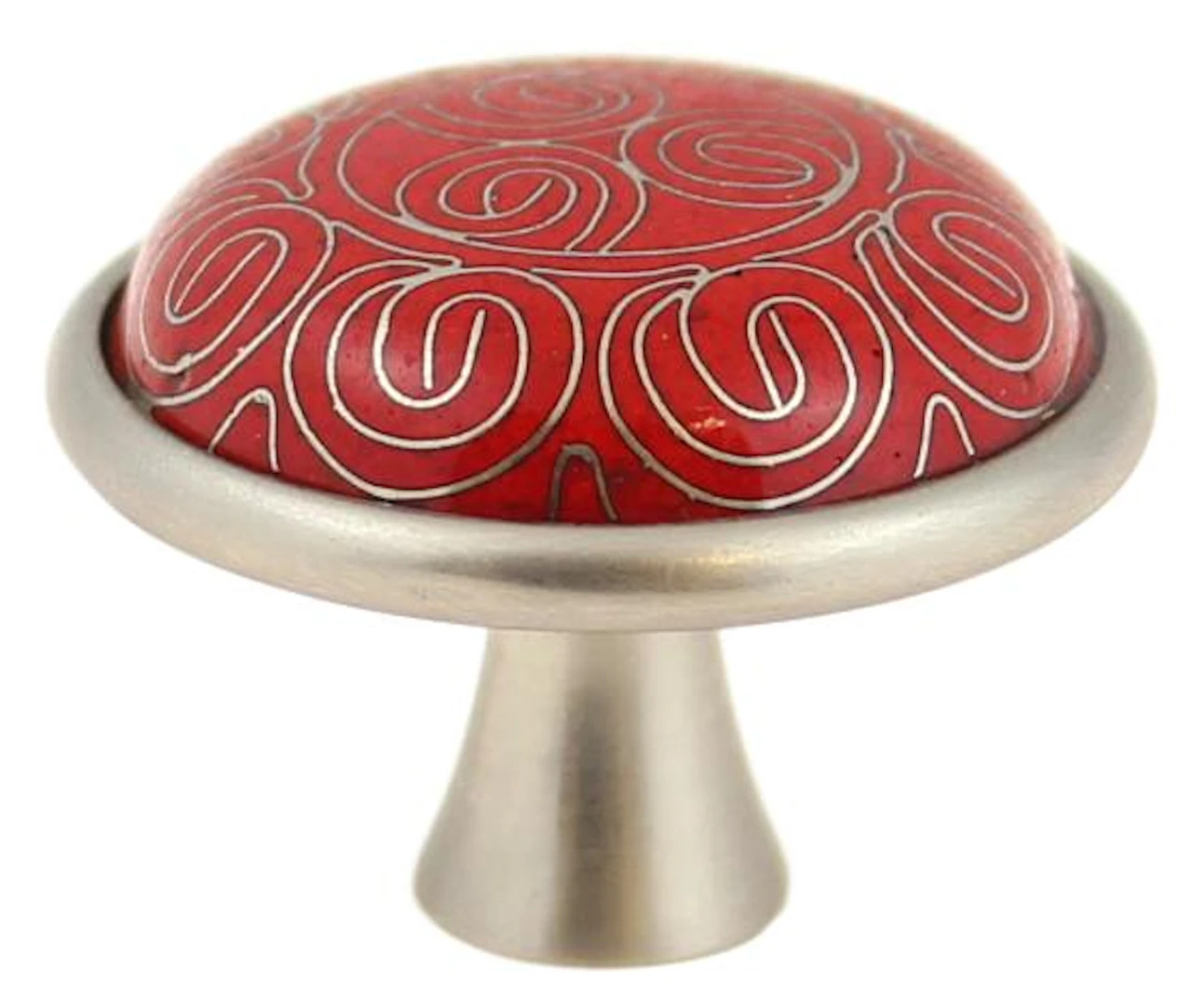 Betsy Field Design An attractive cloisonne red knob with silver wire designs on a satin pewter base.Beautiful cloisonne knob. Cloisonne is a beautiful style of artwork in which hand laid thin metal bands are applied in an intricate pattern and then inlaid with colorful ceramics. Each pull is an actual work of art. This knob will dress up any cabinet or drawers for that special refined look.