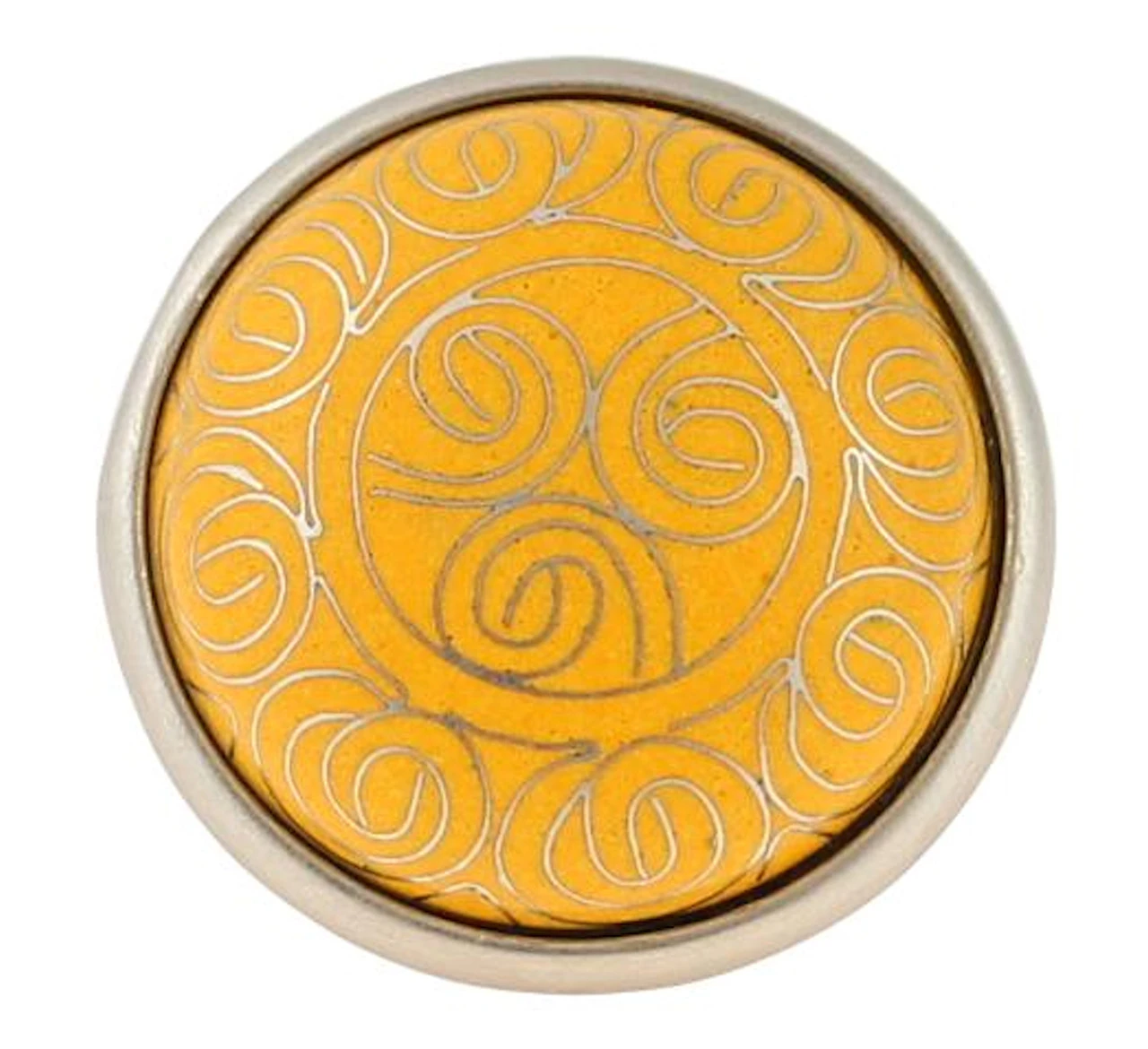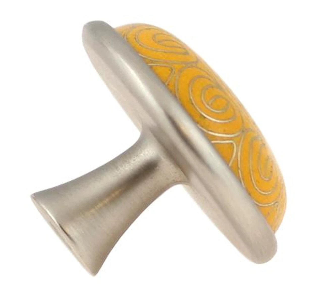 A genuine yellow cloisonne knob to add a touch of Old World elegance to any piece of furniture or cabinet. The center is yellow with swirls and has brush satin pewter showing through. The base is Brush Satin Pewter. Beautiful cloisonne knob. Cloisonne is a beautiful style of artwork in which hand laid thin metal bands are applied in an intricate pattern and then inlaid with colorful ceramics. Each pull is an actual work of art.
