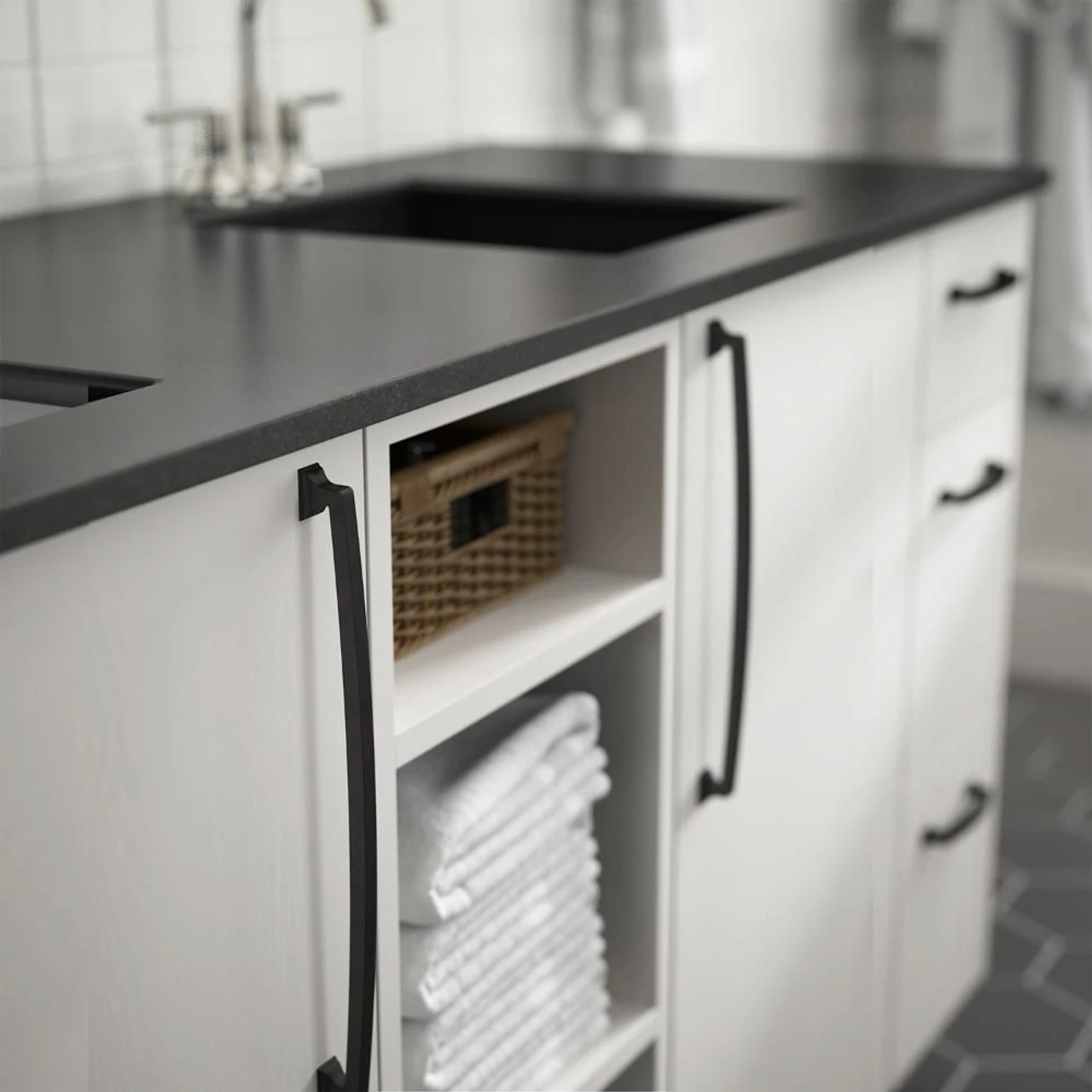 Colossus – 12″ Appliance Pull in a beautiful black. Centers: 12″ (305mm) Length: 12.9″ Width: 0.9″ Projection: 2.2″ Comes with mounting hardware. Liberty Hardware
