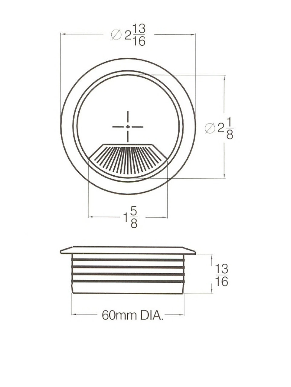 25 Desk Grommets – 60mm This small plastic desk grommet is great for keeping your desk free of annoying wires. This grommet has a 6 cm diameter and a lip that overlaps another 1/2 cm in radius. The wire hole measures app. 2 cm x 4 cm and slides open or shut.,Fits hole size 60mm(2-3/8), overall size is 2-13/16″ inside top ring diameter is 2-1/8″. Height under lip on the bottom is 13/16″. Made of polypropylene