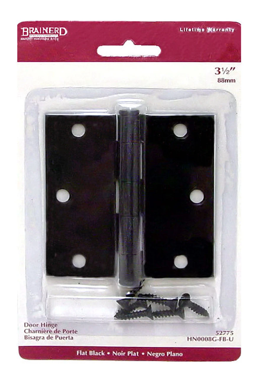 3 1/2″ Flat Black Door Hinge With Square Corners. Retail carded with screws and mounting instructions. 1 per package.