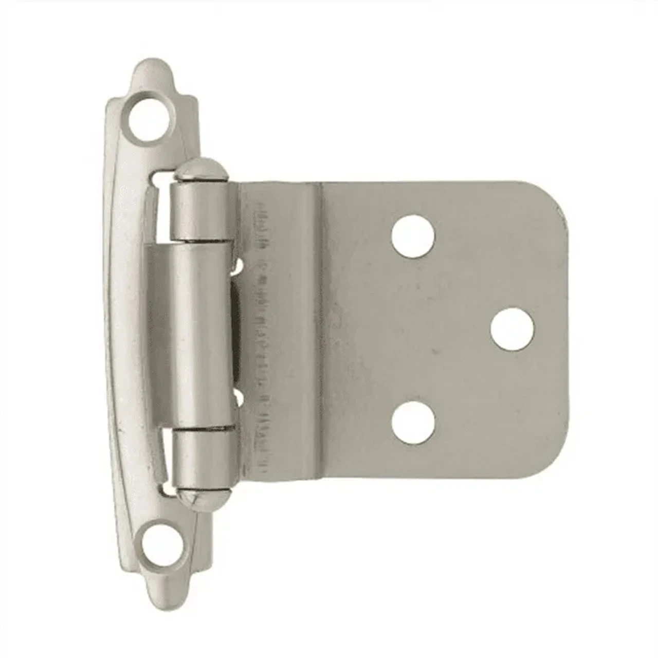 Surface Mount Hinge – 3/8″ inset – semi concealed, self-closing – Satin Nickel. Comes with screws and bumpers. Priced in pairs.