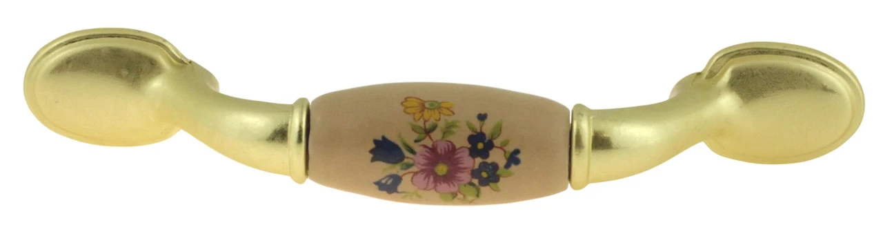 Traditional Bright Brass Pull – Almond-Flowered Ceramic Insert 3″Cc This is the drawer pull for you. This bright brass pull has a beautiful ceramic insert with a flower arrangement.