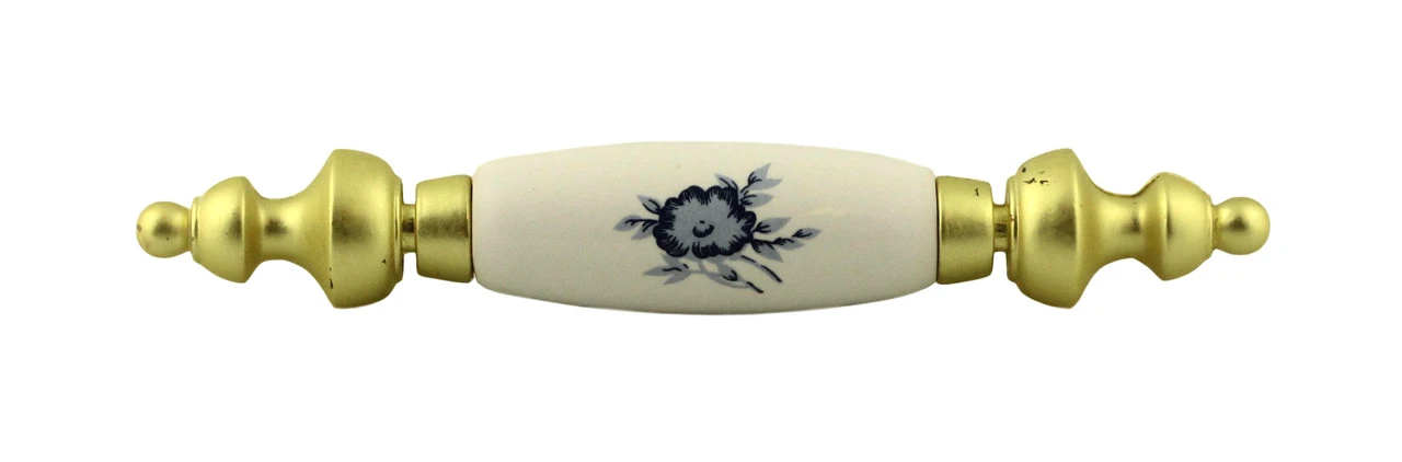 Blue and White Floral Ceramic center, Pull ends in Polished Brass, this is from the Liberty Hardware Ceramic Collection. This white ceramic center with blue flowers is very attractive with the polished brass ends, and matches our knob L-P95719-WB-A.