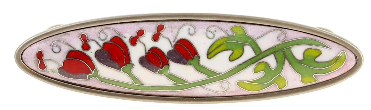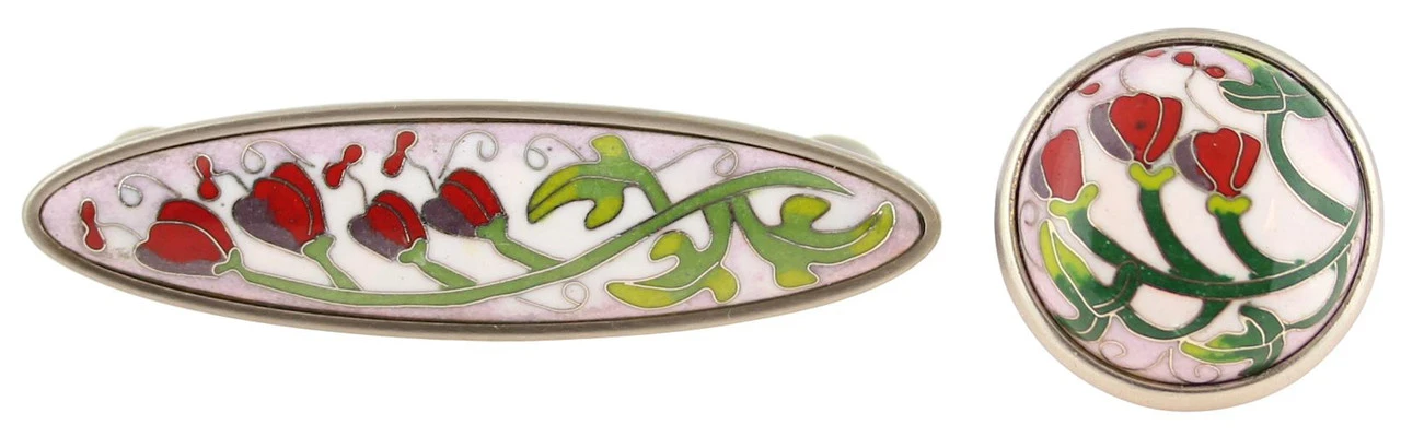 Beautiful cloisonne bleeding heart pull. Cloisonne is a beautiful style of artwork in which hand laid thin metal bands are applied in an intricate pattern and then inlay-ed with colorful ceramics. Each pull is an actual work of art.