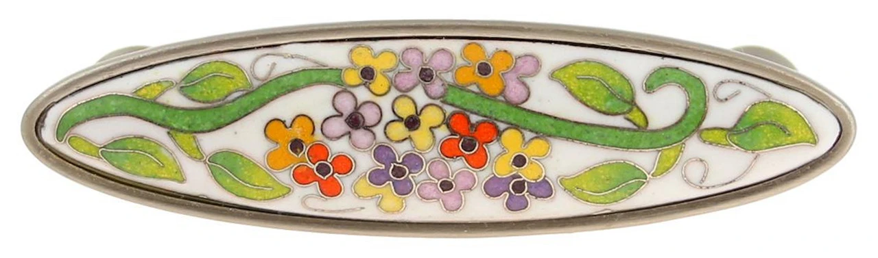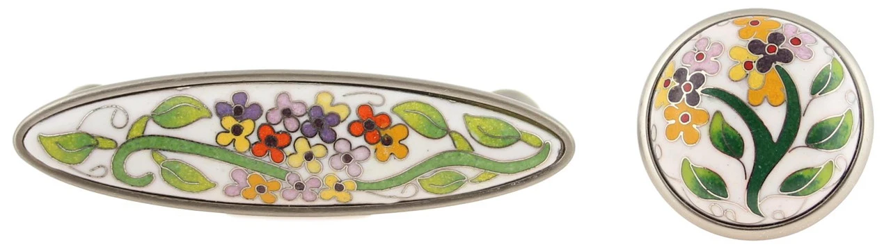 Beautiful cloisonne lantana pull. Cloisonne is a beautiful style of artwork in which hand-laid thin metal bands are applied in an intricate pattern and then inlay-ed with colorful ceramics. Each pull is an actual work of art.