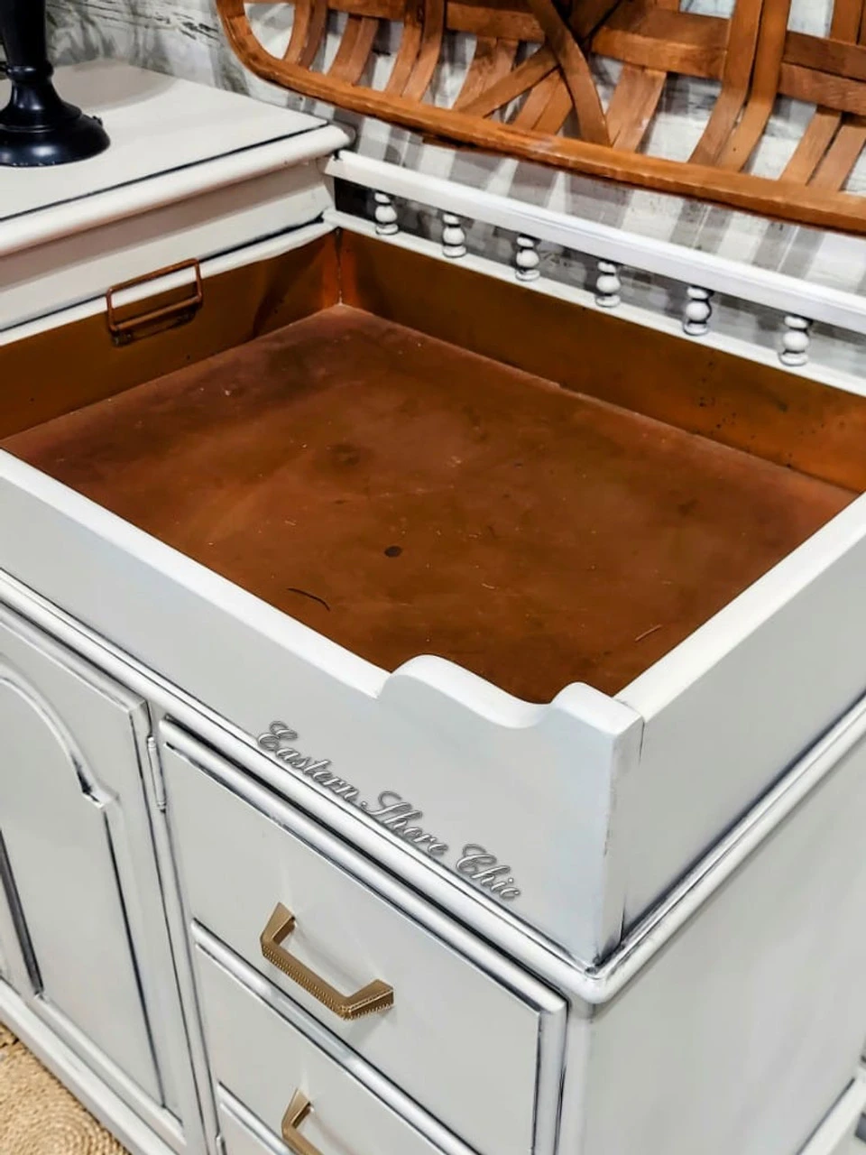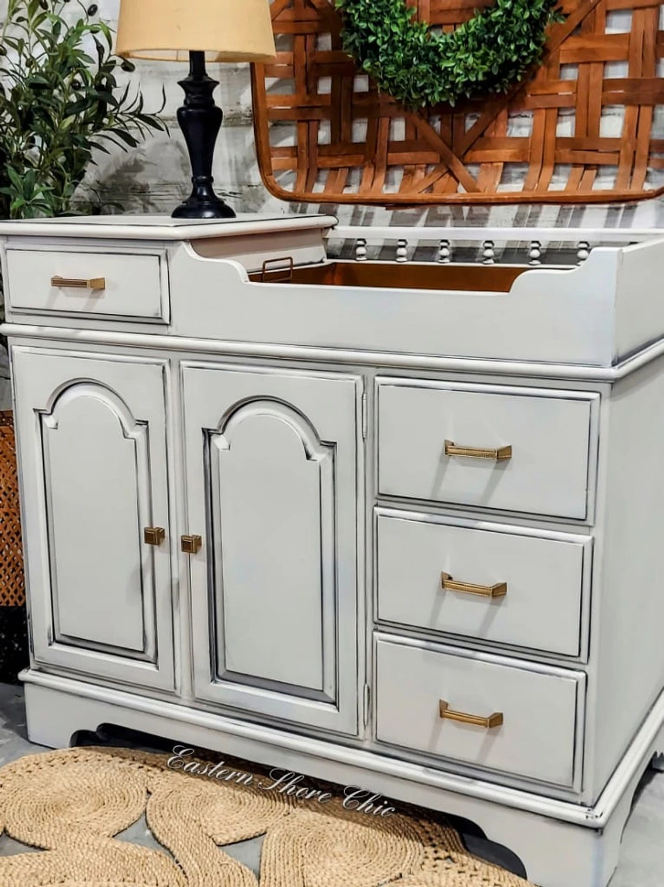 The additional images show this champagne bronze pull in use on a lovely washstand makeover from Eastern Shore Chic with it’s matching champagne bronze knob. The elegant beaded pulls come in a 5″ and 3 3/4″ as well and can be seen below in the “You May Also Like” section.