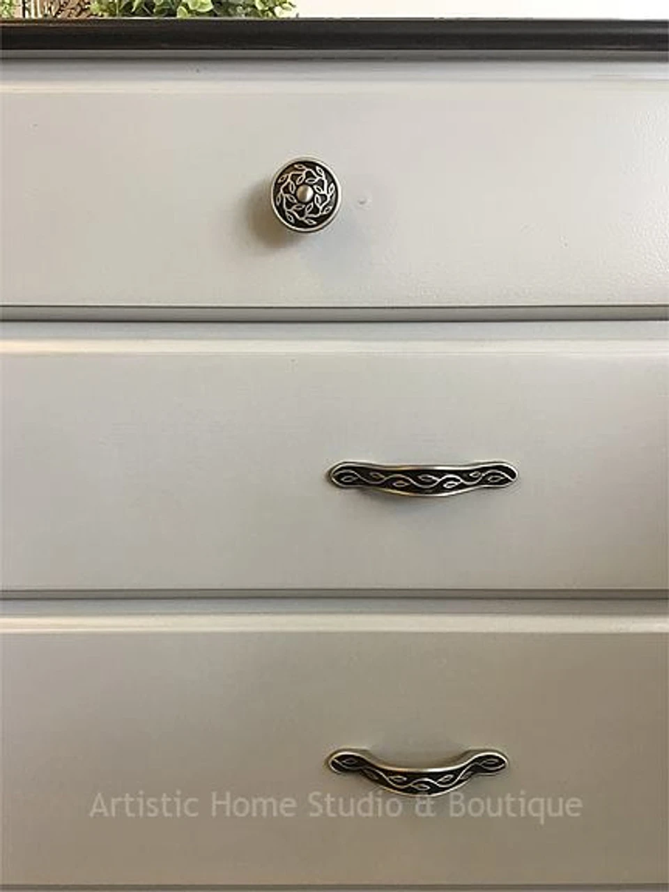 Leaf and vine design Betsy Field Brushed Satin Pewter in Black with a raised leaf and vine design that is very elegant looking. See matching knob L-PBF588Y-BSB-C