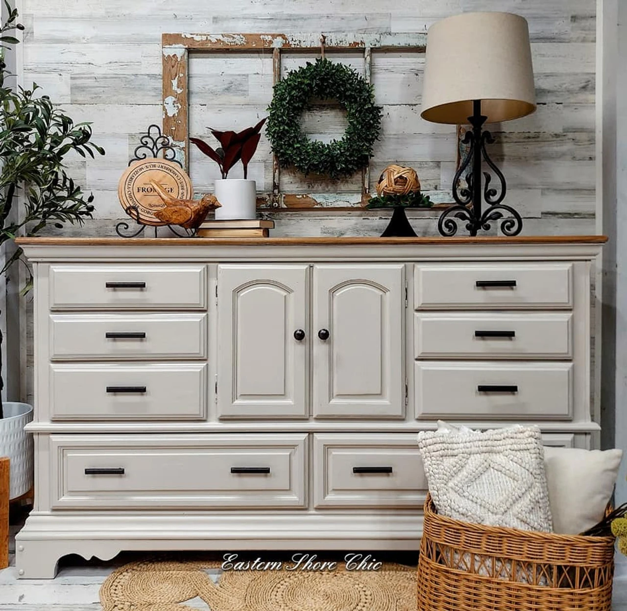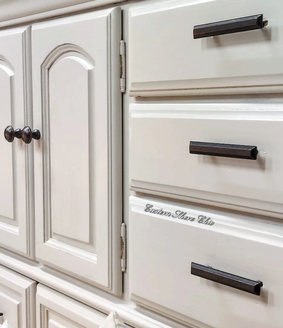 A traditional drawer handle in a statuary bronze finish. Made of zinc die cast. Thank you to furntiure designer Roberta at Eastern Shore Chic for sharing the lovely piece in the additional images!